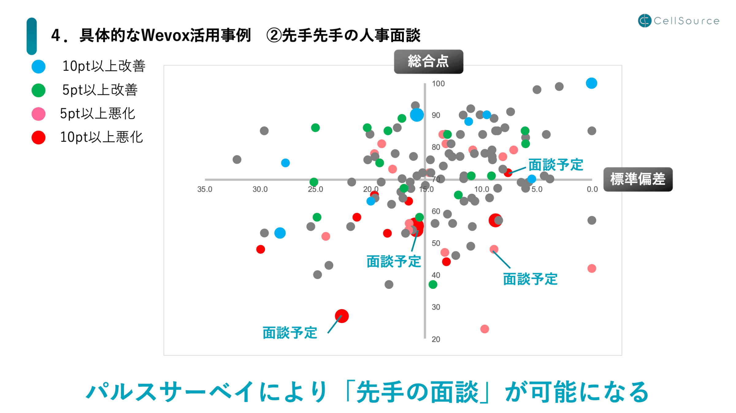 次のWevox活用事例は、先手の人事面談についてです。この図は、先ほどのグラフに「面談予定」という文字が足されたものですが、弊社では毎月必ず最低7人は面談をするというルールを設定しています。この図はあくまでもサンプルですが、10点以上悪化した赤色になっている人、ある程度高い点数でも悪化傾向にある人たちなど、HR戦略部長と2人で選んで面談しています。