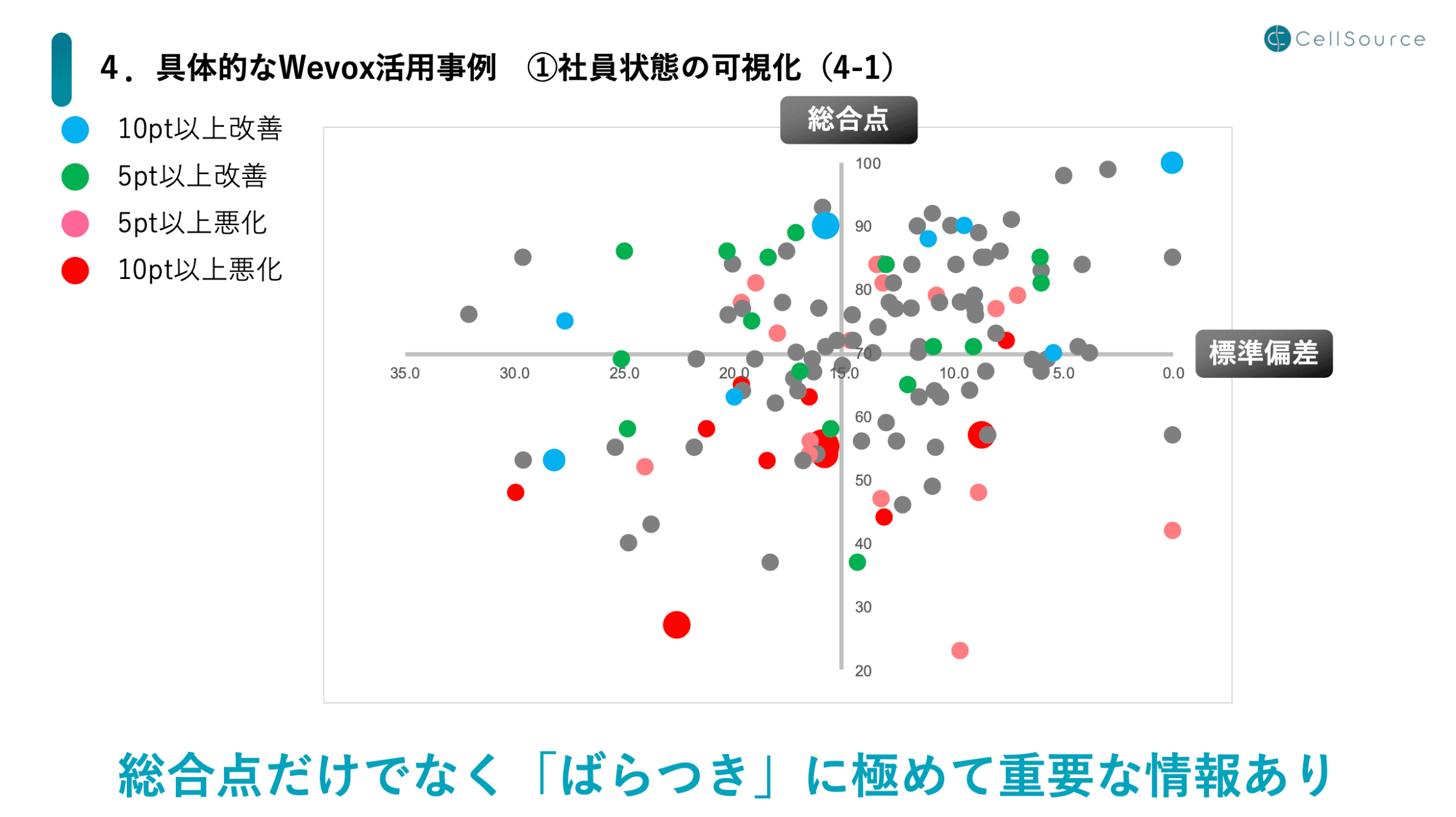 続いて、Wevoxの具体的な活用事例をご紹介していきます。まず、社員状態の可視化のために使用している特徴的なものとして、標準偏差を使って2軸で分解したこのグラフがあります。例えば一番右上に位置する大きな水色の丸の人は標準偏差が0なので、32問に対して全て100点を入れていることが示されています。とある質問には0〜20点、とある質問には100点といったように点数がまばらな人は左側に寄っていきます。そのうえで、下にいくほど低い点数の人になっていき、たまに80点や100点をつけている人が左下に位置します。右下に位置している人は、おしなべて低い点数しかつけていない人ということになります。