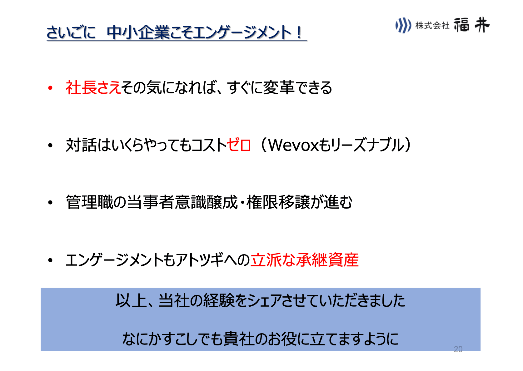最初は本当に藁にもすがる思いでWevox、エンゲージメントの門を叩き、結果はすぐには出ませんでしたし、スコアが上がるまで時間がかかりました。目にしたくない耳に入れたくないような声を聞きながら取り組みを続けてきましたが、それも運命だと捉えて、正面突破で問題解決の努力だけは継続してきたつもりです。社員数が増え続けている中で、また新たな問題が起こることもあるかとは思いますが、私自身も皆さんと同様、なるべく逃げずにより良い会社づくり、より良い中小企業づくりに邁進していきたいなと思った次第でございます。本日は本当にありがとうございました。