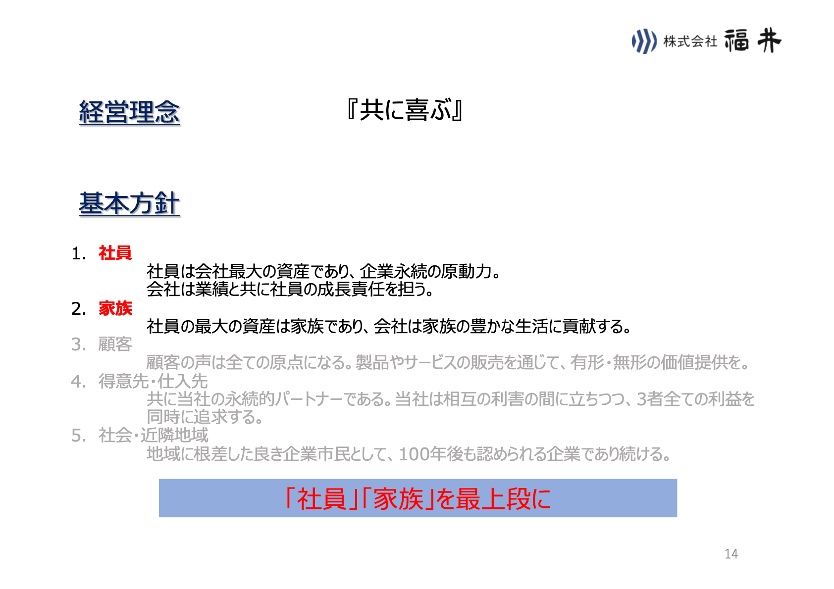 まず取り組んだのが経営理念の浸透です。「共に喜ぶ」という理念は創業者の時代からありましたが、言葉だけがポツンと額に入れて語られているような状態でした。それではいけないと、会社側が社員に対してどういう考え方で接しているかを改めて言葉にして基本方針としてまとめ、事あるごとに伝えて浸透活動を行うようにしました。