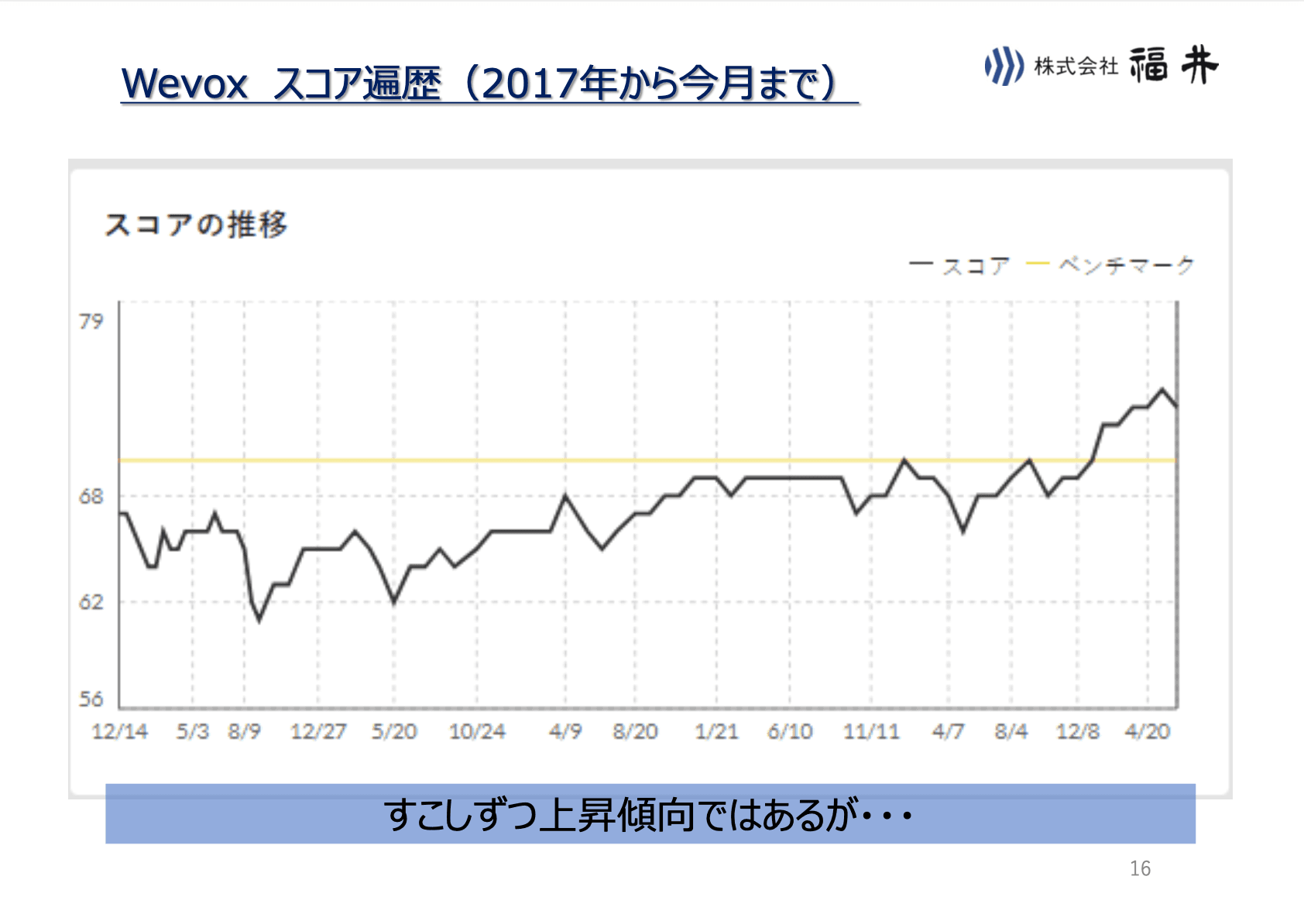 これは、Wevoxの利用開始時から現在に至るまでのスコアの推移です。初回は2017年12月、67点でスタートしています。現在は73〜74点ぐらいまでスコアが上がっていますが、前半部分はかなり苦労しまして、67点というスコアを超えるのに2年半ぐらいかかってしまいました。エンゲージメント活動はすぐに結果が出にくいものなので、途中で心が折れてしまいそうになりますが、長く続けていけばいくほどじわじわと結果が出るものなのかなと思います。