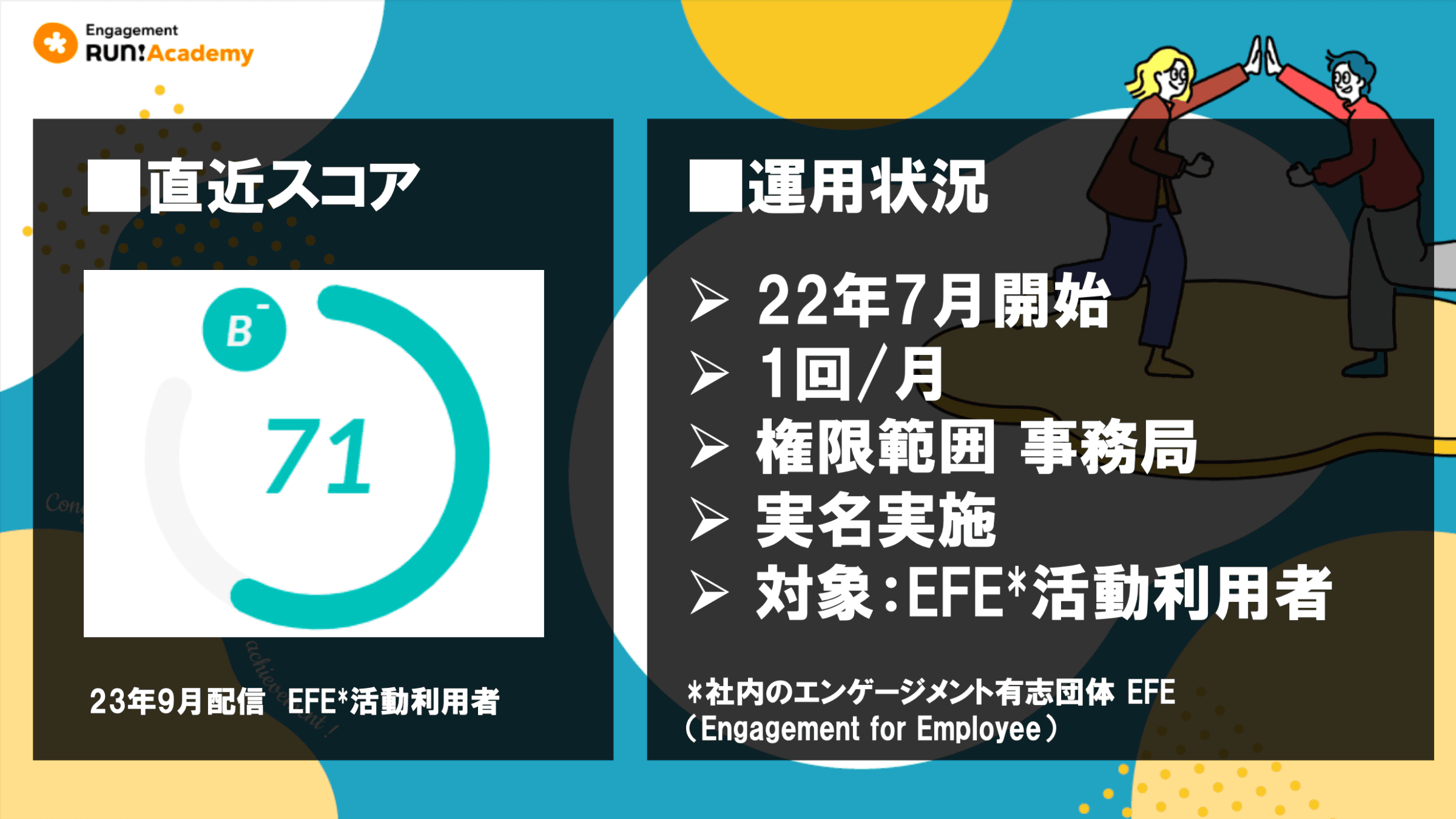 こちらは直近のWevoxの利用状況です。運用を始めてから1年ほどが経過していますが、71ぐらいが直近のスコアの平均です。サーベイは実名で実施しており、実施頻度は月1回ほど。閲覧権限は、社内の有志が集まってできた事務局チームが持っています。サーベイの対象は、全社あるいは組織という単位ではなく、エンゲージメントに興味のあるメンバーが集まる「Engagement for Employee(EFE)」というコミュニティを対象にしています。