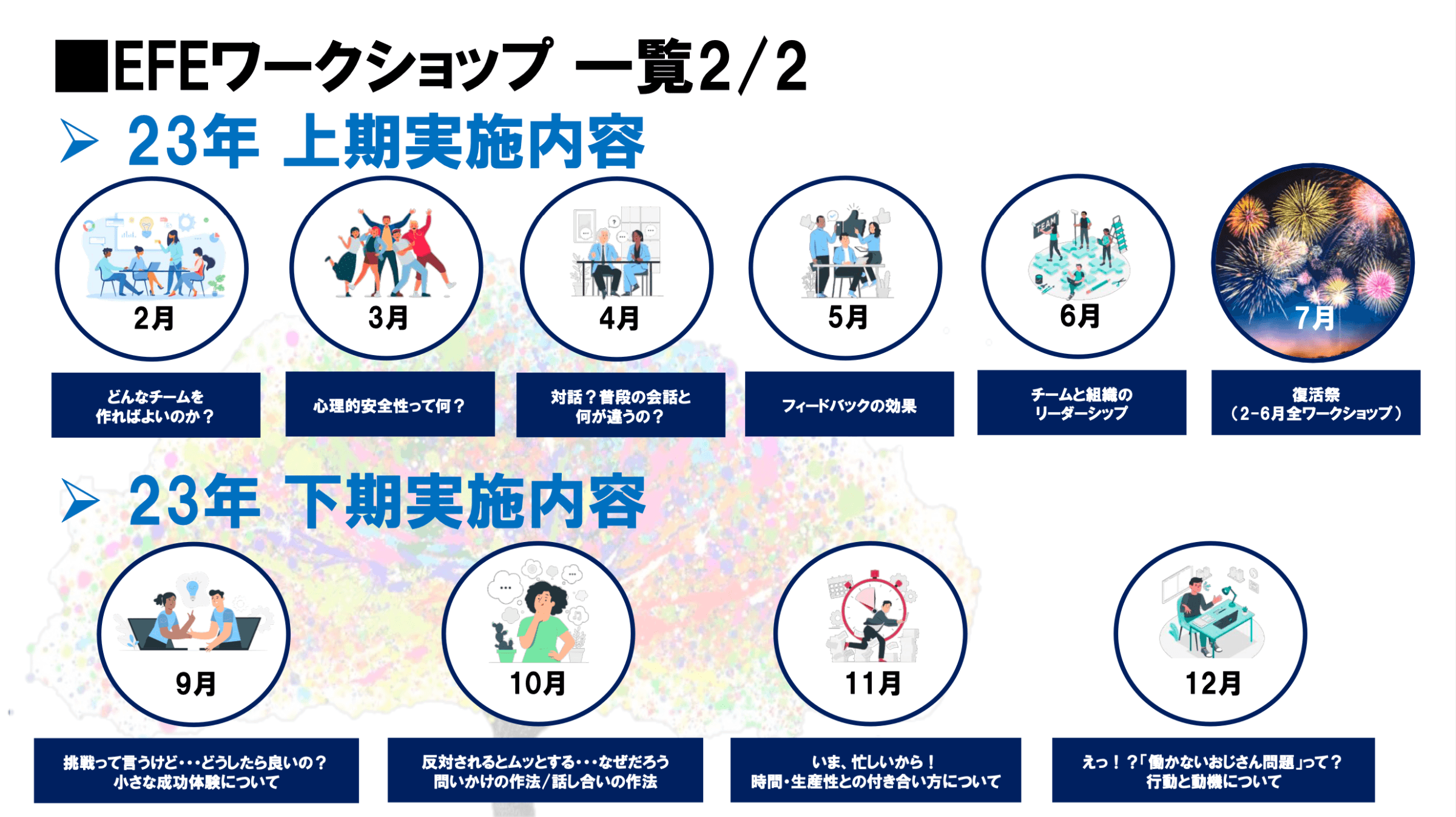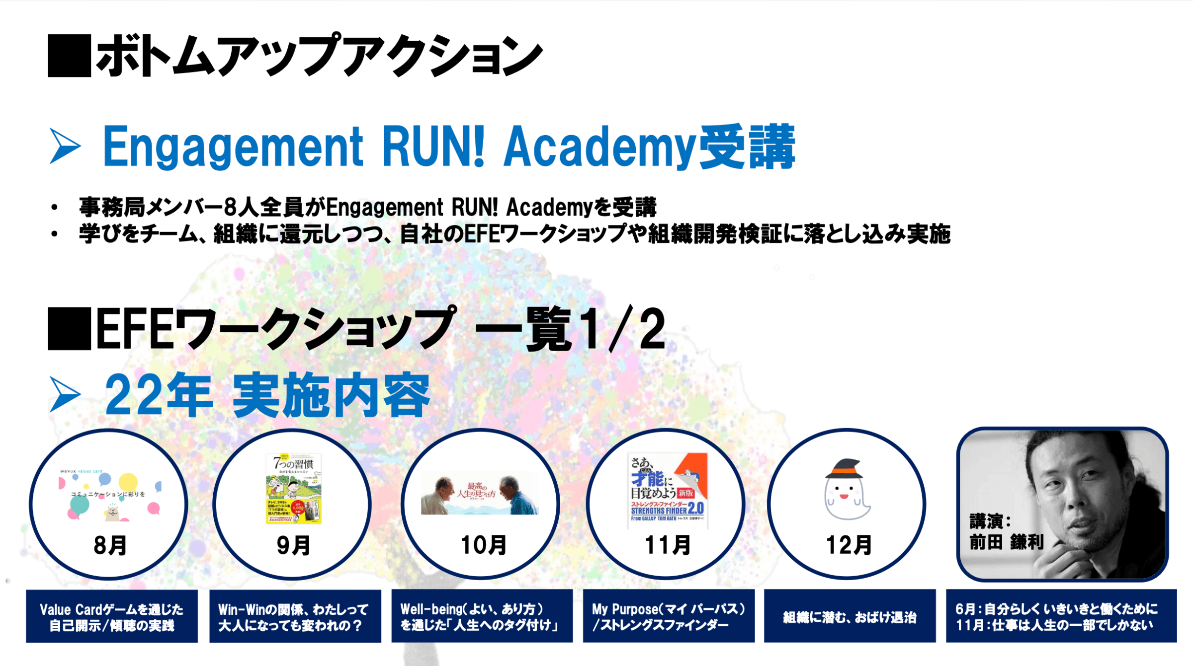 ボトムアップアクションの1つには、事務局全員でのEngagement Run! Academyの受講も含まれます。このアクションでは、一丸となって学んだことを自社内でカスタムし直し、落とし込むようにしています。EFEワークショップは、22年度は8月から12月にかけて、特別講演を含めた形で以上のようなアジェンダセットで実施しました。