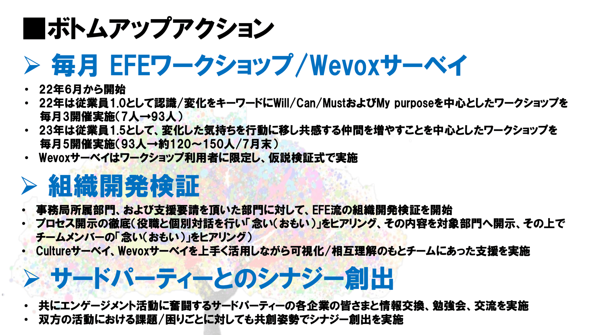 続いてボトムアップのアプローチのご紹介です。これらはすべて、さきほどお話した社内コミュニティEFEが実施しているアクションプランです。