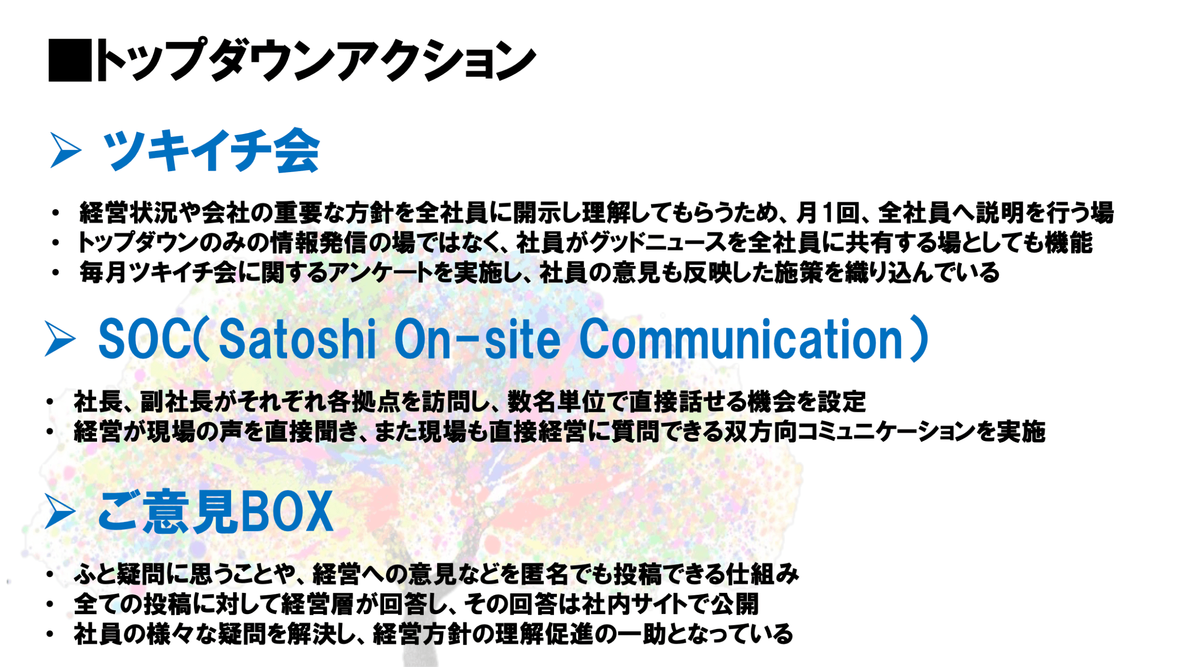 弊社のトップダウンアクションを3点ご紹介します。1つ目は「ツキイチ会」です。これは、経営状況や重要施策を全従業員に対して月に1回報告するための場です。トップダウンだけの一方的なメッセージではなく、社員が報告したいグッドニュースも含めて共有できるような場でもあります。また、このツキイチ会を通して全従業員からのアンケートも実施しており、アンケートの結果を活かした内容でも開催しています。