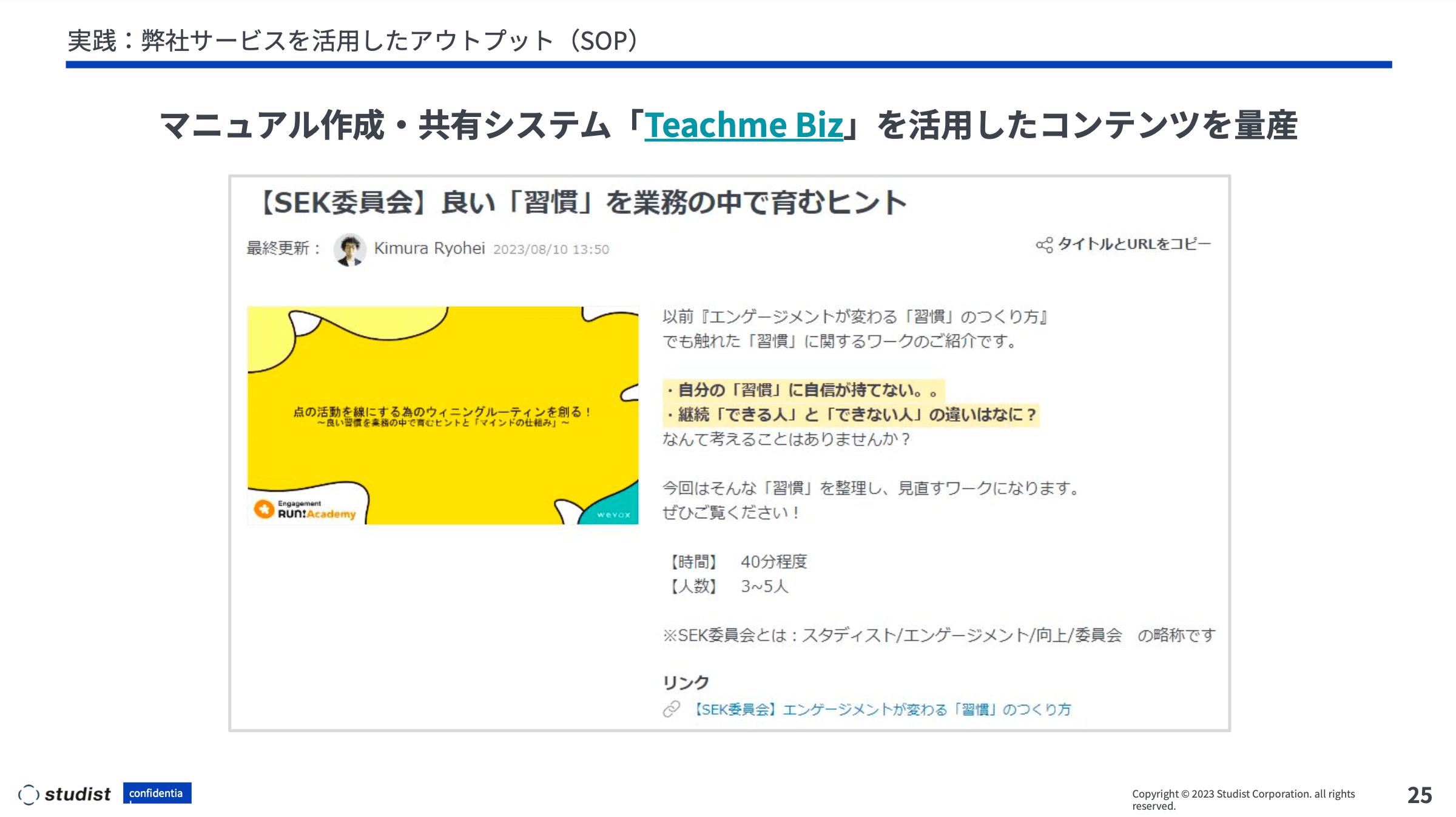木村:その他にも、Engagement Run!Academyの講座でインプットさせていただいたものをベースに、弊社サービスのマニュアル作成・共有システム「Teachme Biz」を使ってマニュアルをコンテンツ化し、マネージャーに提供しています。PV数も可視化できるのですが、もちろん数はコンテンツによって異なります。具体的な数で確認できる分、取り入れてもらいやすいもの、そうじゃないものの傾向が分かるので、人事メンバーにとって非常に参考になる情報となっていますし、工夫や改善も行いやすいです。