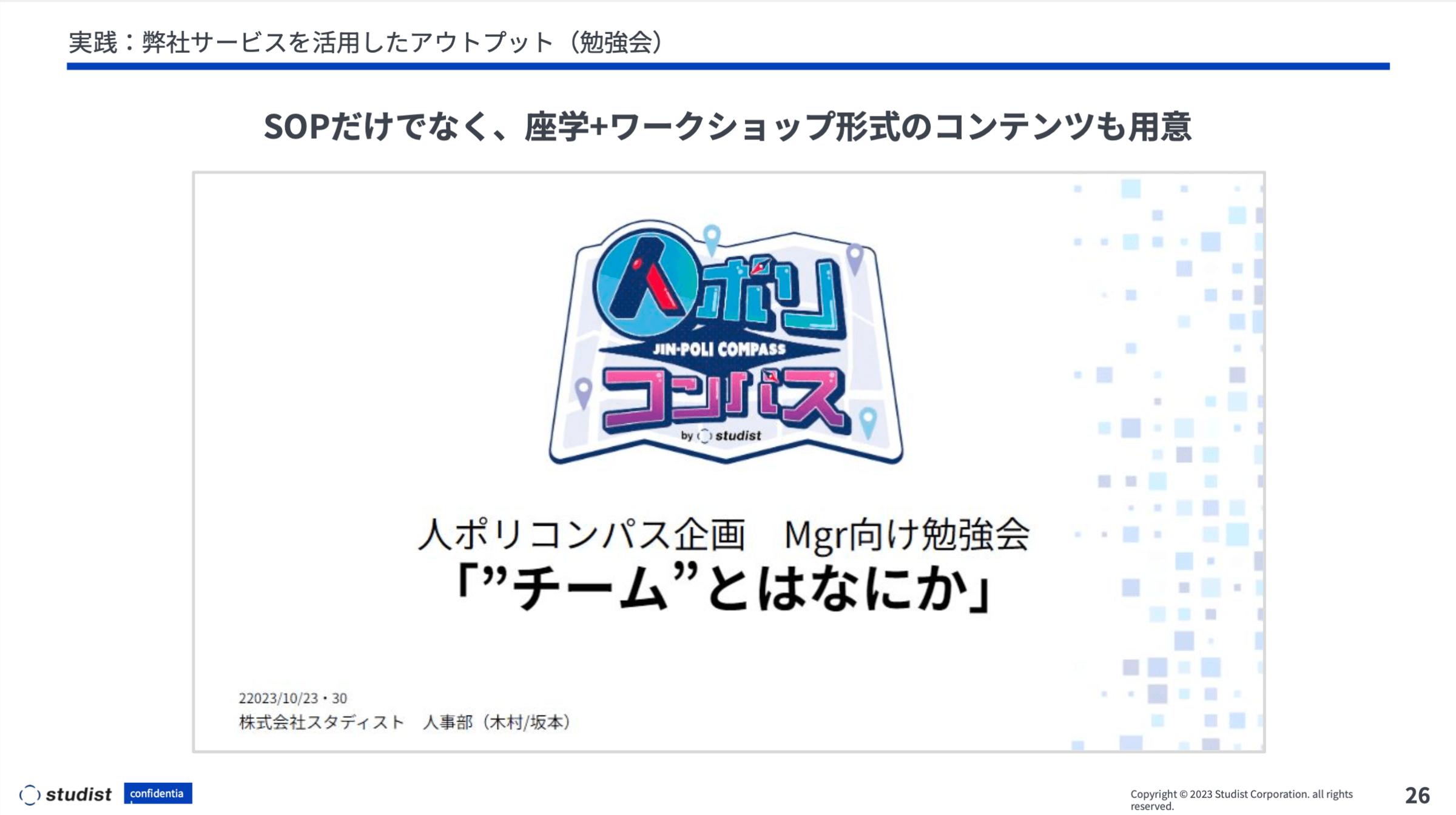 マニュアルは能動的に見てもらわないと難しいので、先月から座学とワークショップを絡めたコンテンツの実施も開始しました。こちらは実際に使った資料の表紙です。人事ポリシーにより親しみを持って取り組んでもらえるようにという願いを込めて、弊社のデザイナーにお願いして「人ポリコンパス※」というロゴを作ってもらいました。