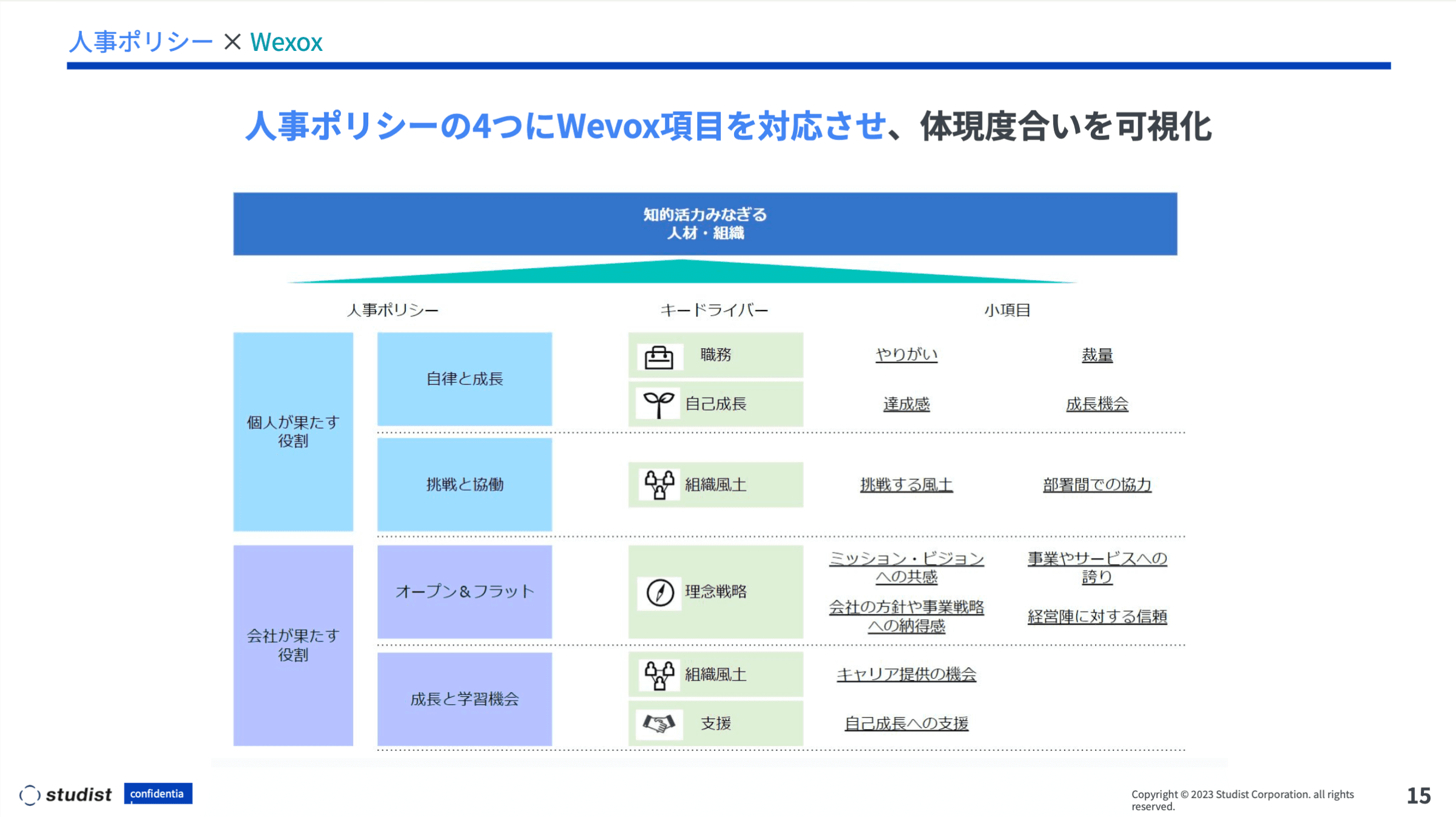 そんな人事ポリシーとWevoxをどうやって結びつけているのかというと、先ほどの個人とスタディストの4つの役割をWevoxの項目に対応させて、この人事ポリシーがどう体現されているのかを可視化・モニタリングする、という意味付けにしています。また、そのモニタリング結果をまとめて、毎月の人事ポリシーの体現度合を経営ボードに報告しています。