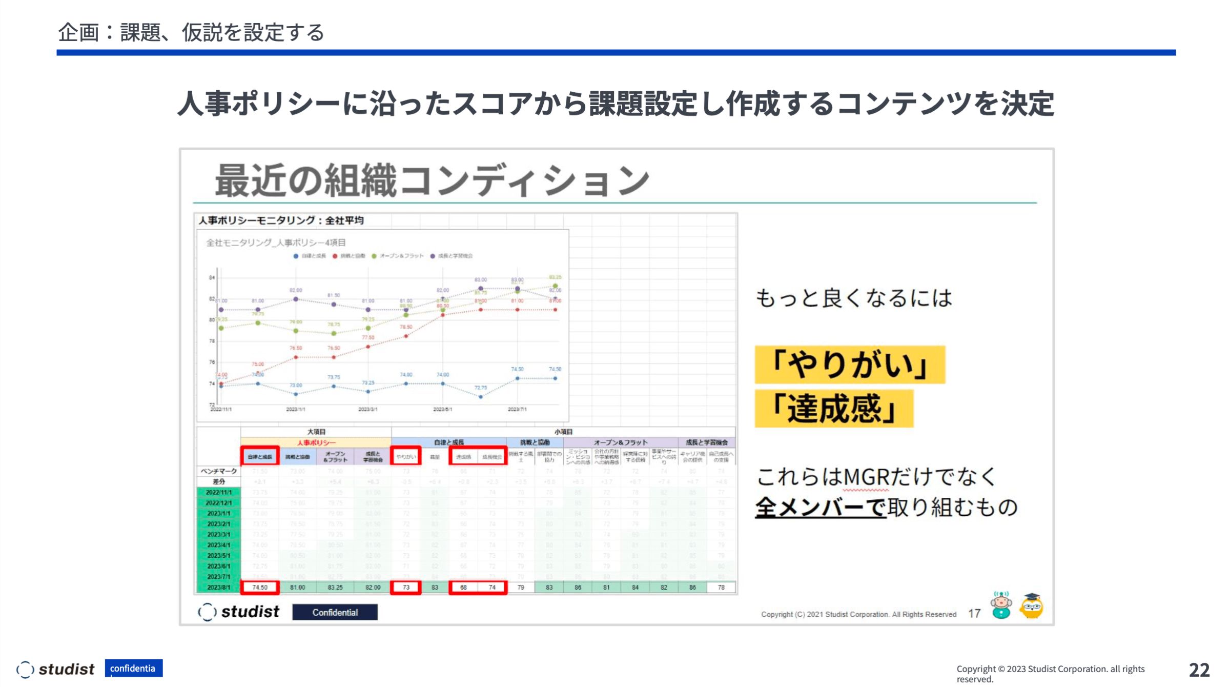 この学習フェーズを踏まえて、次は企画フェーズへと入っていきます。まずは課題や目標とする仮説を立てようということで、今井のパートの最後にも出てきた、人事ポリシーとWevoxを紐付けしたスコアをベースに課題設定をしました。私が定期的に行っている全社会議では組織コンディションの発表などを行いますが、このスライドはそこで使用したものです。