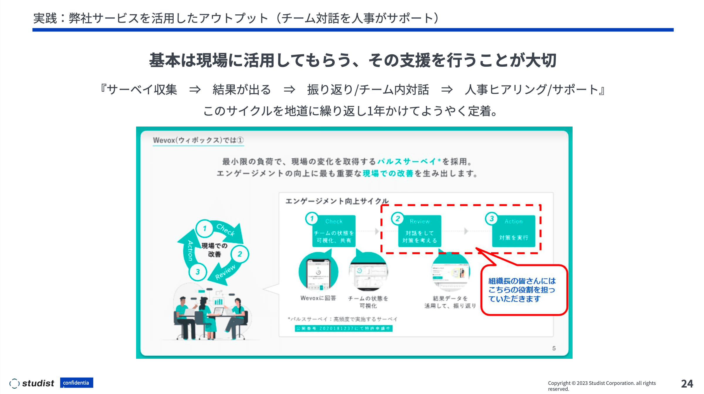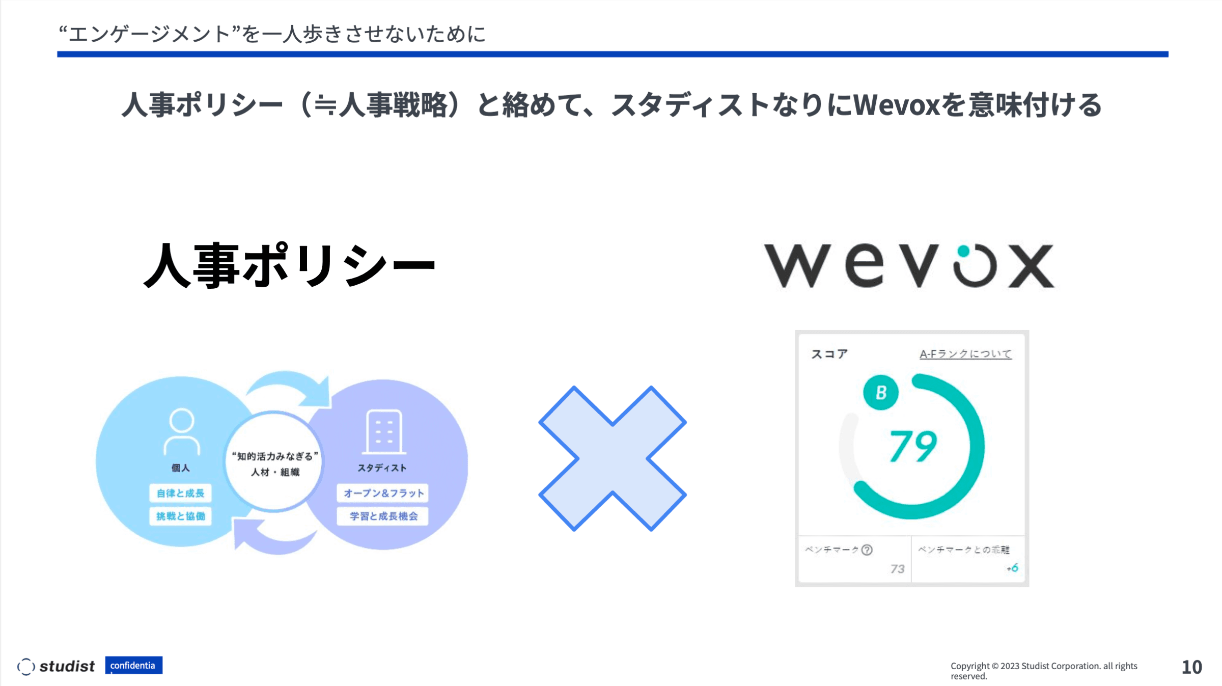 今井:今回のTeamwork Sessionのタイトルにもある通り、エンゲージメントという大切な概念を一人歩きさせないため、弊社が掲げている人事ポリシーと絡めて、我々スタディストなりにWevoxを使う意味付けを行っています。