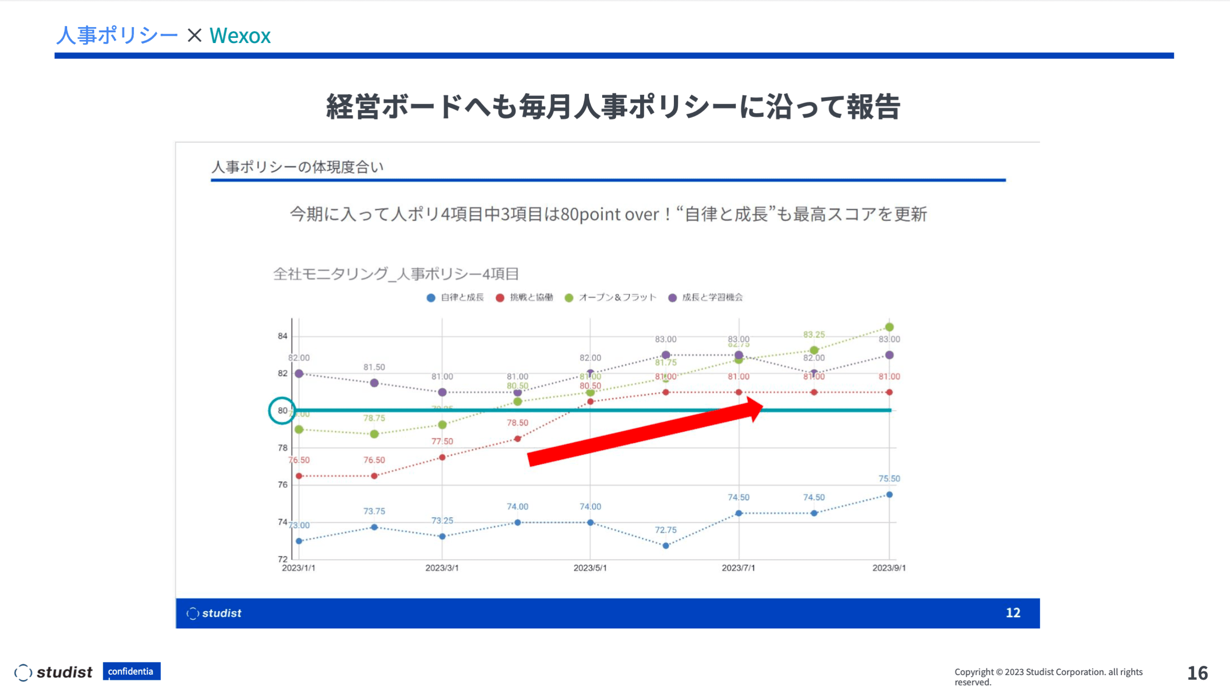 これは10月に共有したものです。「人事ポリシーの4項目中3項目は80ポイントを超えており、自律と成長のスコアは上がりきらないものの最高スコアを達成しました」といった内容を報告するわけですが、ただの報告だけではなく、経営陣全員で今の人や組織の状態について会話をするための呼び水としても活用できています。