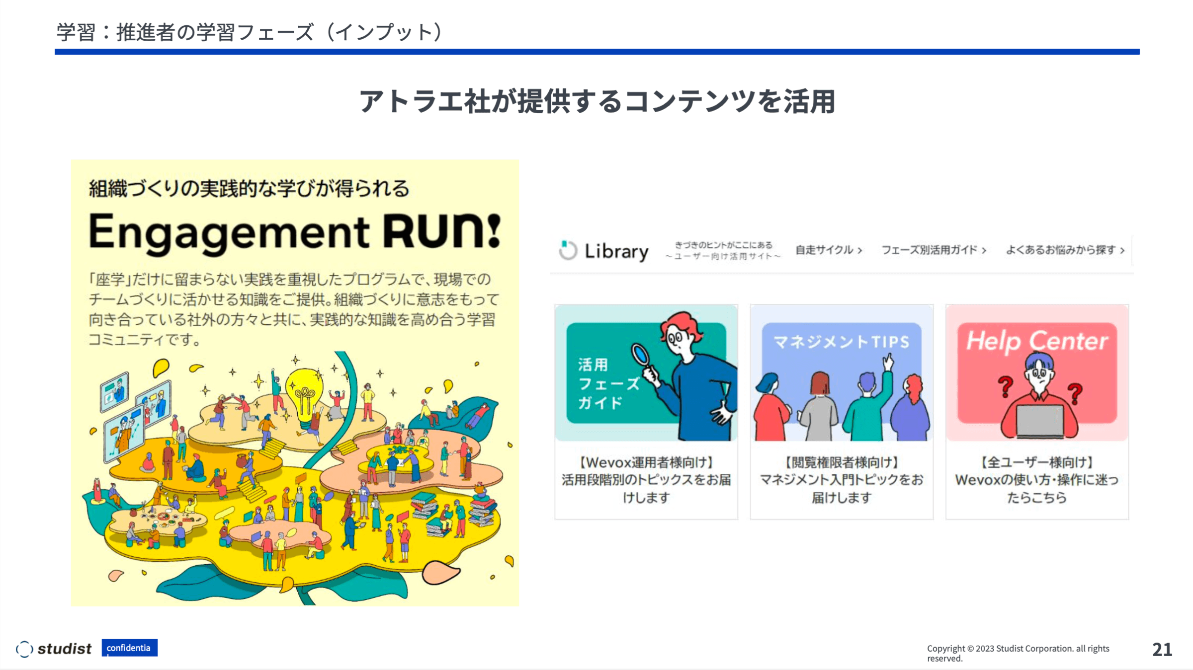 1つ目は「学習」です。推進者は人事部のメンバーなのですが、まずは推進者たる我々がWevoxをうまく利用し、人事ポリシーの実現に向けて様々な取り組みをしていかないといけません。そのための材料集めということで、アトラエさんのコンテンツを存分に活用させていただきました。Engagement Run!Academyのクラスでは初級・中級・上級というレベルに応じたコンテンツを提供してくださっていますし、右側のWeライブラリのコンテンツも手順の進め方が非常に分かりやすく、本当に助けられました。