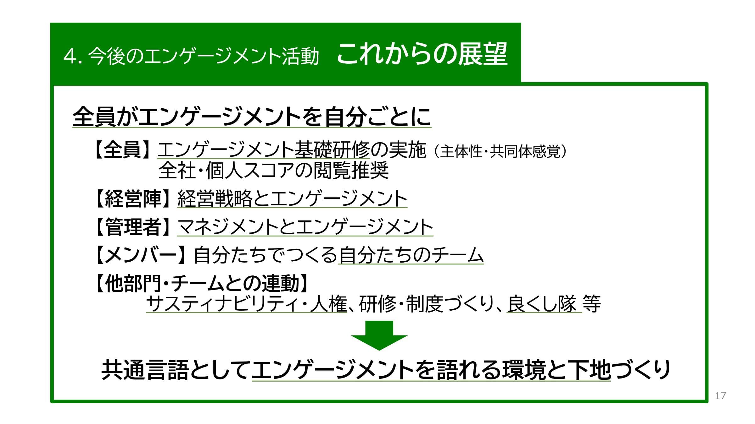 最後に、これからの展望をご紹介します。事務局では、全員がエンゲージメントを自分ごとにできることを目指しています。それに向けて、全社でのエンゲージメント基礎研修などを実施したいと考えており、エンゲージメントの基本的な部分である主体性・共同体感覚と呼ばれる部分を社内で育むものにできないかと検討中です。また、業務上でのそれぞれ役割とエンゲージメントをどう結びつけていくかを考え、担う役割と関連性のある施策や企画を進めることも視野に入れています。