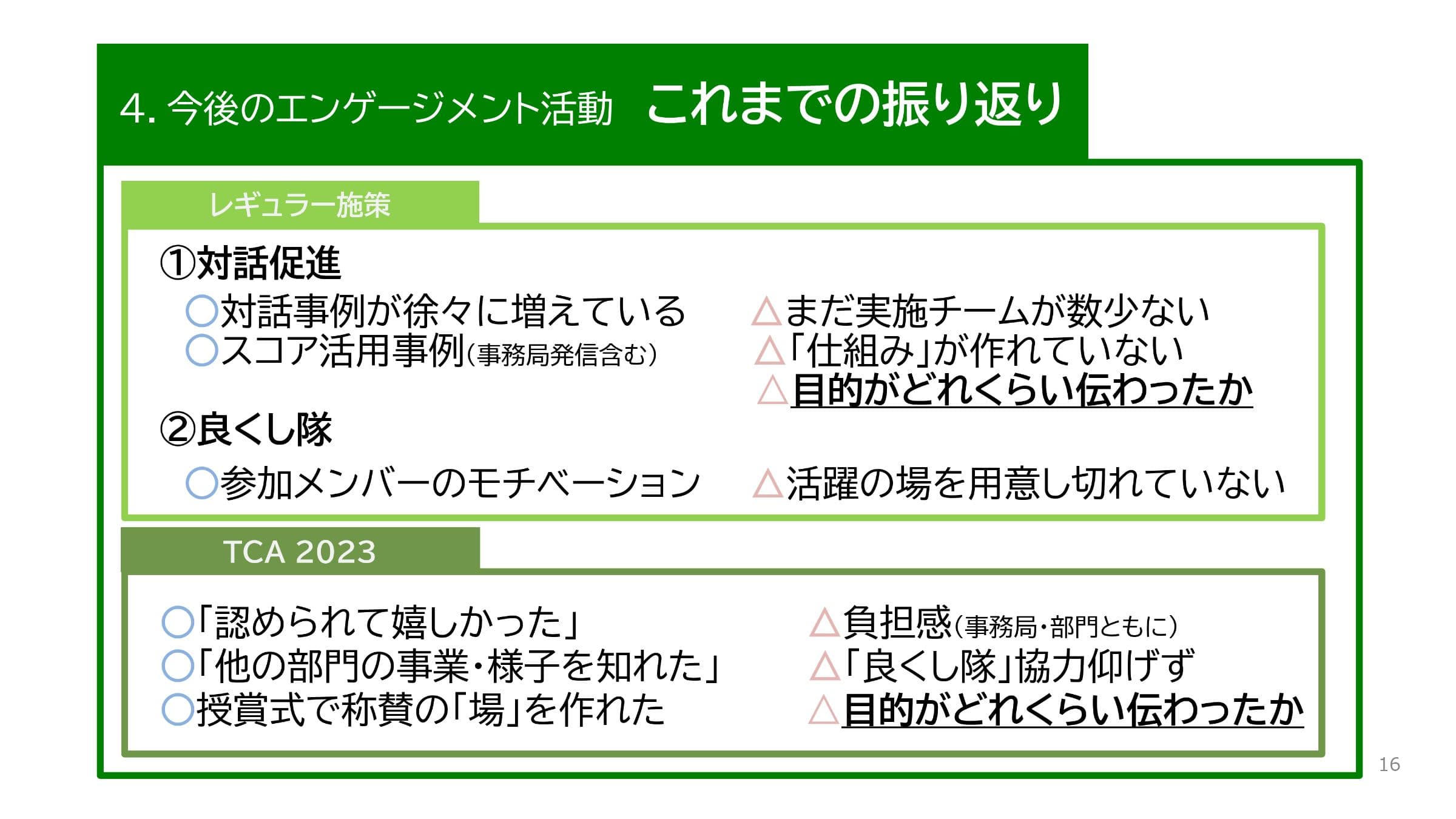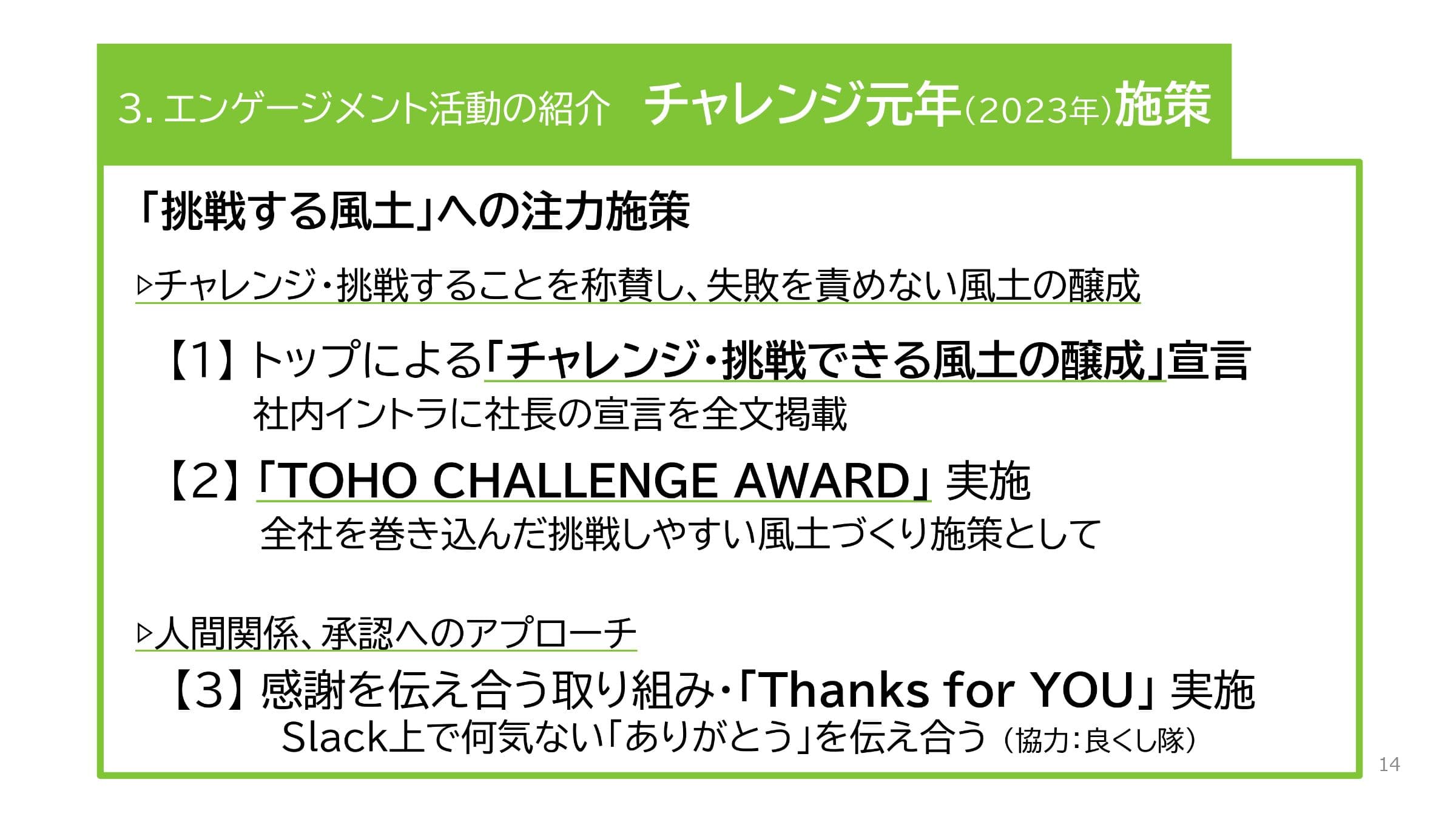 2023年4月には、コミュニケーションツールSlackの全社導入プロジェクトと連携し、より良い社内風土を醸成する有志グループとして、ちょっと昭和なネーミングの「良くし隊」を立ち上げました。また同年6月にはEngagement Run! Academyの講師の方をお招きしまして、役員向けにワークショップ型の研修を実施しました。より経営戦略とエンゲージメントが連動しやすい環境を作るため、この研修以降は役員に全部門・全組織のスコア閲覧権限を付与しています。同年8月からは挑戦する風土醸成のための全社企画として、「TOHO CHALLENGE AWARD」という施策もスタートしました。