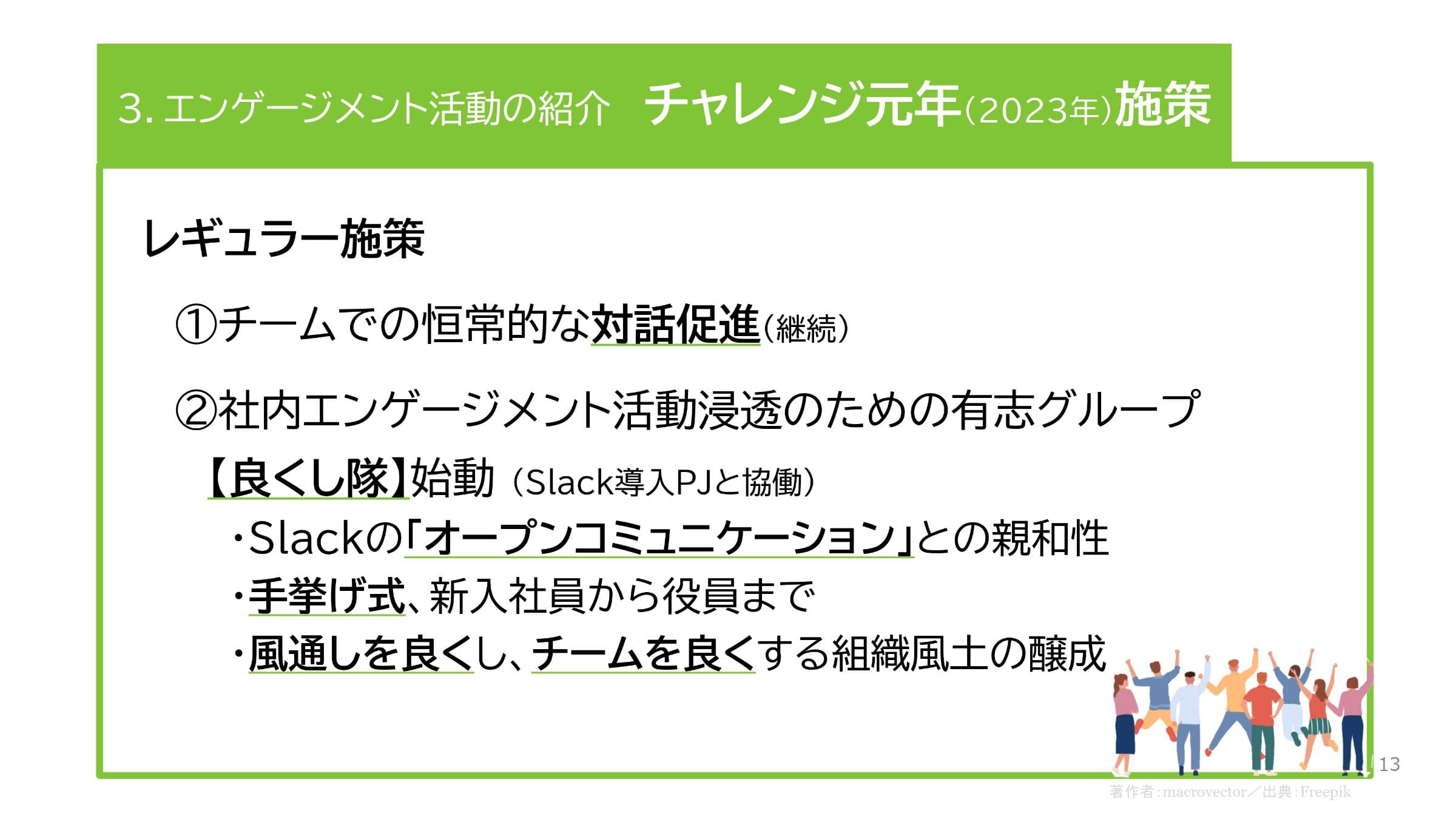 そして2023年のチャレンジ元年に入っていきますが、対話の促進と並行して、4月に先ほどご紹介した「良くし隊」を始動させました。Slackはオープンコミュニケーションを行うツールで、エンゲージメントとの親和性は非常に高く、相乗効果を生むのではないかという狙いから、Slackの導入プロジェクトと共に立ち上げました。