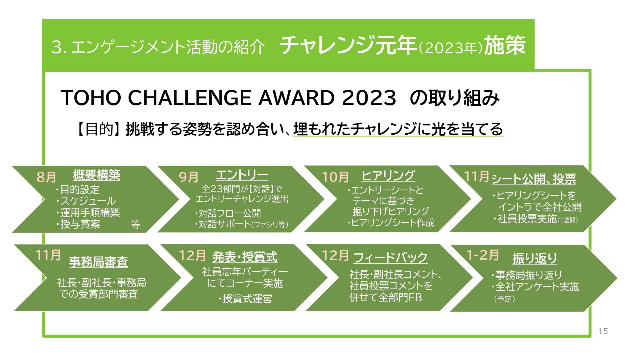 2つ目は、先ほども紹介した、全社を巻き込んでの挑戦しやすい風土作りを目的としたTOHO CHALLENGE AWARDの立ち上げです。