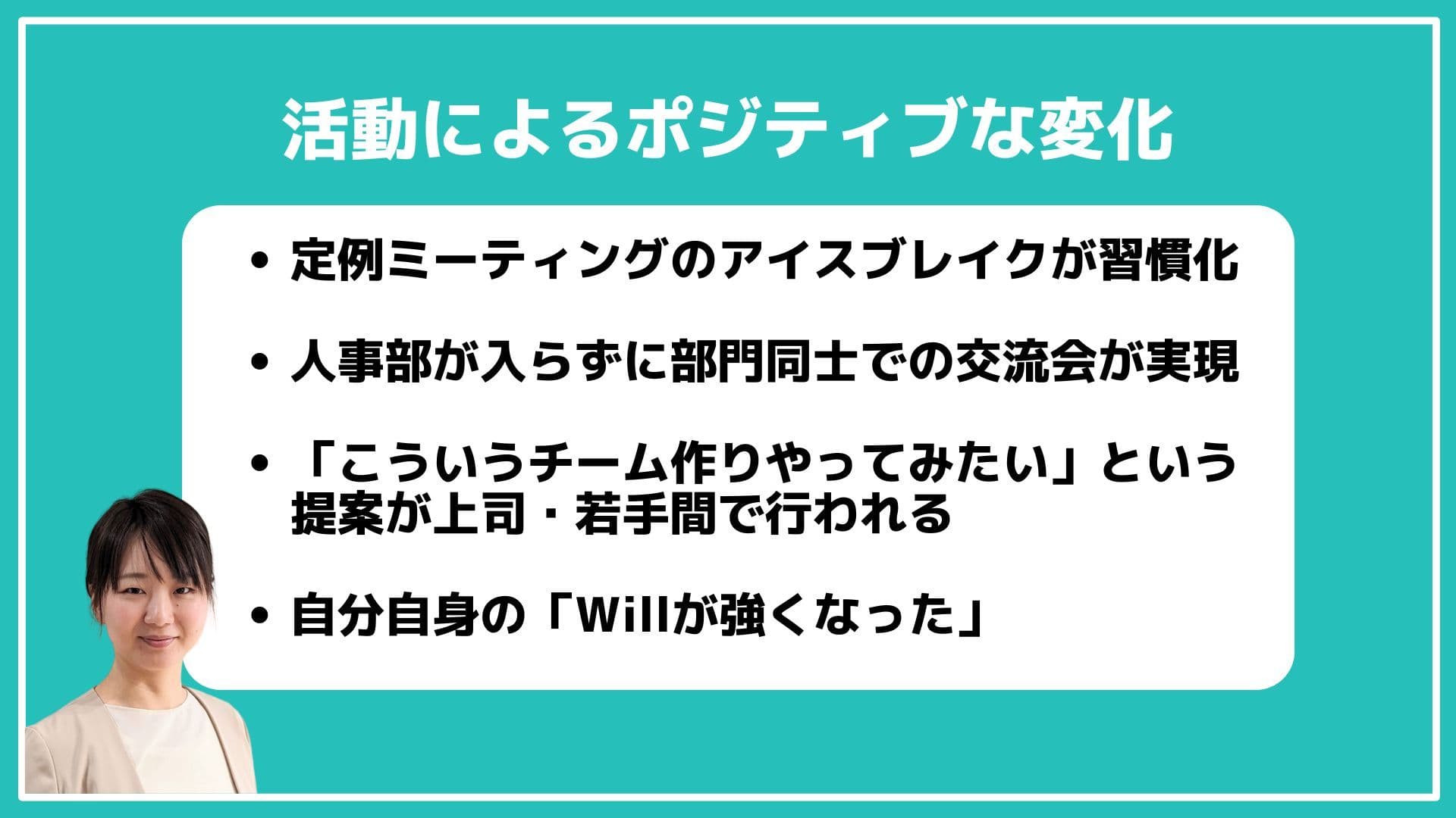 例えば、定例のチームミーティングでのアイスブレイクが習慣化したり、エンゲージメント向上に取り組んでいらっしゃる他社さんと繋がって、人事部が入らなくても部門同士での交流会が実現するようになったり、上司から若手、若手から上司に対してこういうチーム作りやってみたいという提案が行われるようになったケースもありました。