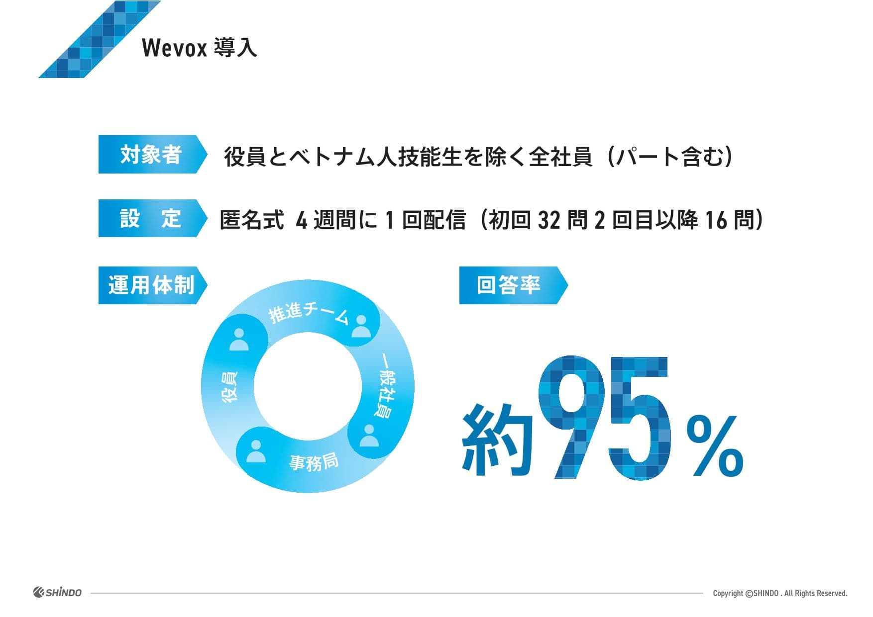 対象は、役員とベトナム人技能生を除く、パートを含めた全社員です。ベトナム人技能生の方々についてはこれから回答していただけたらと思ってはいるのですが、現在は対象外としています。頻度は4週間に1回、匿名でのアンケート回答という形式です。基本的にはリマインドなどをしながら回答を促していることもあってか、回答率は約95%となかなか高い数字を維持しています。