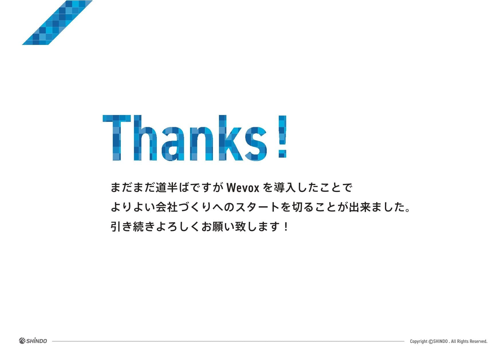 相場(雄):私からお伝えしたいことは、Wevoxが本当に素晴らしいサービスだということと、アトラエの皆さんも非常に素晴らしい方ばかりだということです。Wevoxのおかげで、「シンドーだったらどうするか」と自分の会社の視点で考えて、本日ご紹介したようなアクションを行うことができてきたのかなと思っています。その結果、人間関係の構築にも繋がっていると思いますし、非常にありがたいですね。弊社の理念に合わせて自社にとっていい状態に加工しながら、プラスアルファのアクションをしていくことが、Wevoxという素晴らしいサービスを最大限に活用する方法の一つなのだと思っています。