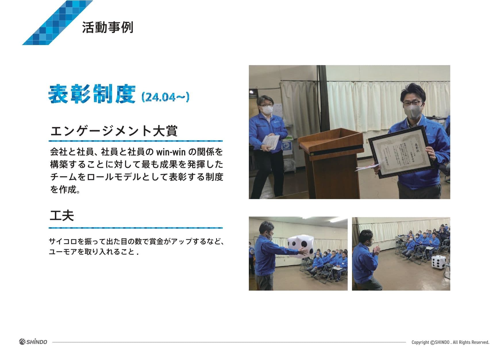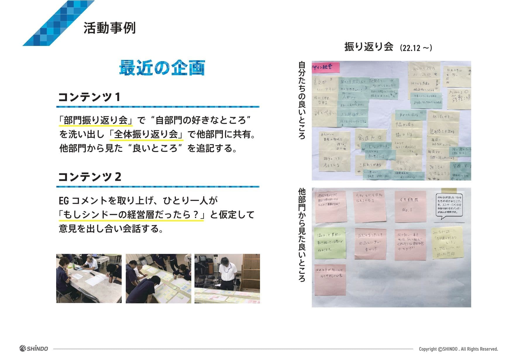 2つ目のコンテンツは、エンゲージメントに毎月寄せられるコメントを取り上げながら、推進チームが「もし自分たちがシンドーの経営層だったらどうするか」という仮定の中で意見を出し合うものです。この企画を通して、1人1人の主体性を促したり、シンドーらしさを考えたりする機会が得られています。スライドにある写真は実際の対話会の様子で、右側の写真は社長が現場に見に来てくださった際の1枚です。
