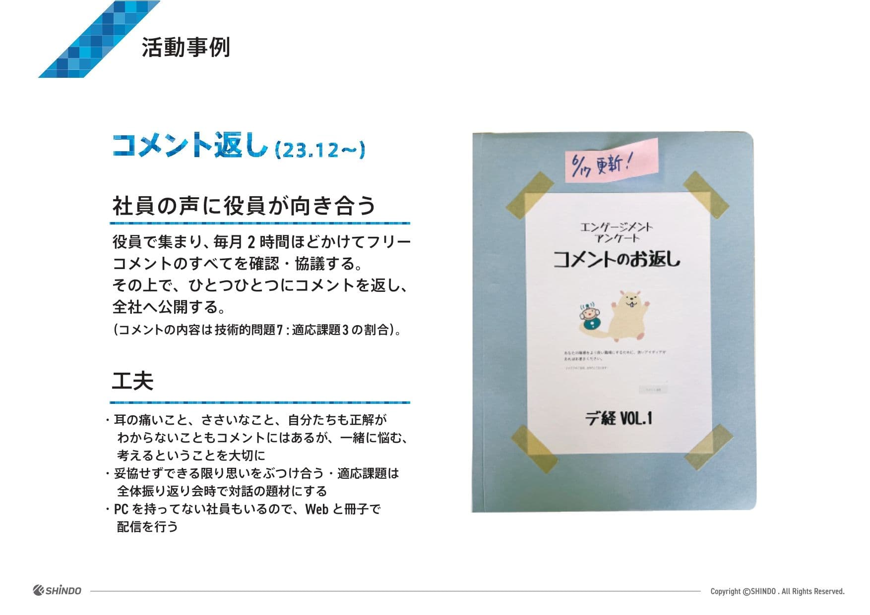 続いてご紹介するのも、弊社の中で非常に特徴的な取り組みです。これは、エンゲージメントで寄せられるコメントの1つ1つに対して役員が協議して、考えた内容を全社にオープンに共有するものです。この会には弊社の会長と社長を含む全ての役員が参加しています。当然、役員同士の意見や考え方も違うので、ぶつかることもありますし、上がってきた意見について社長が自ら現場まで実態を確認しに行くこともあります。弊社の理念や考え方に反しているものがあれば、「うちはこんな風に考えているから、そういった考え方は合わないよ」といったように話をしながら向き合っています。この取り組みは導入当初には行っていませんでしたが、寄せられるコメントに対して、なんとなく見てみぬふりをしてしまっているのではないかと感じたのと、何よりもこういったコメントをしてくださる方と真摯に向き合っていく先に、自社らしさや私たちが大切にしたい理念の実践があると考えて、行うようになりました。役員自身も本気で現場に向き合い、交流していこうとする点は非常にシンドーらしいと自負しています。