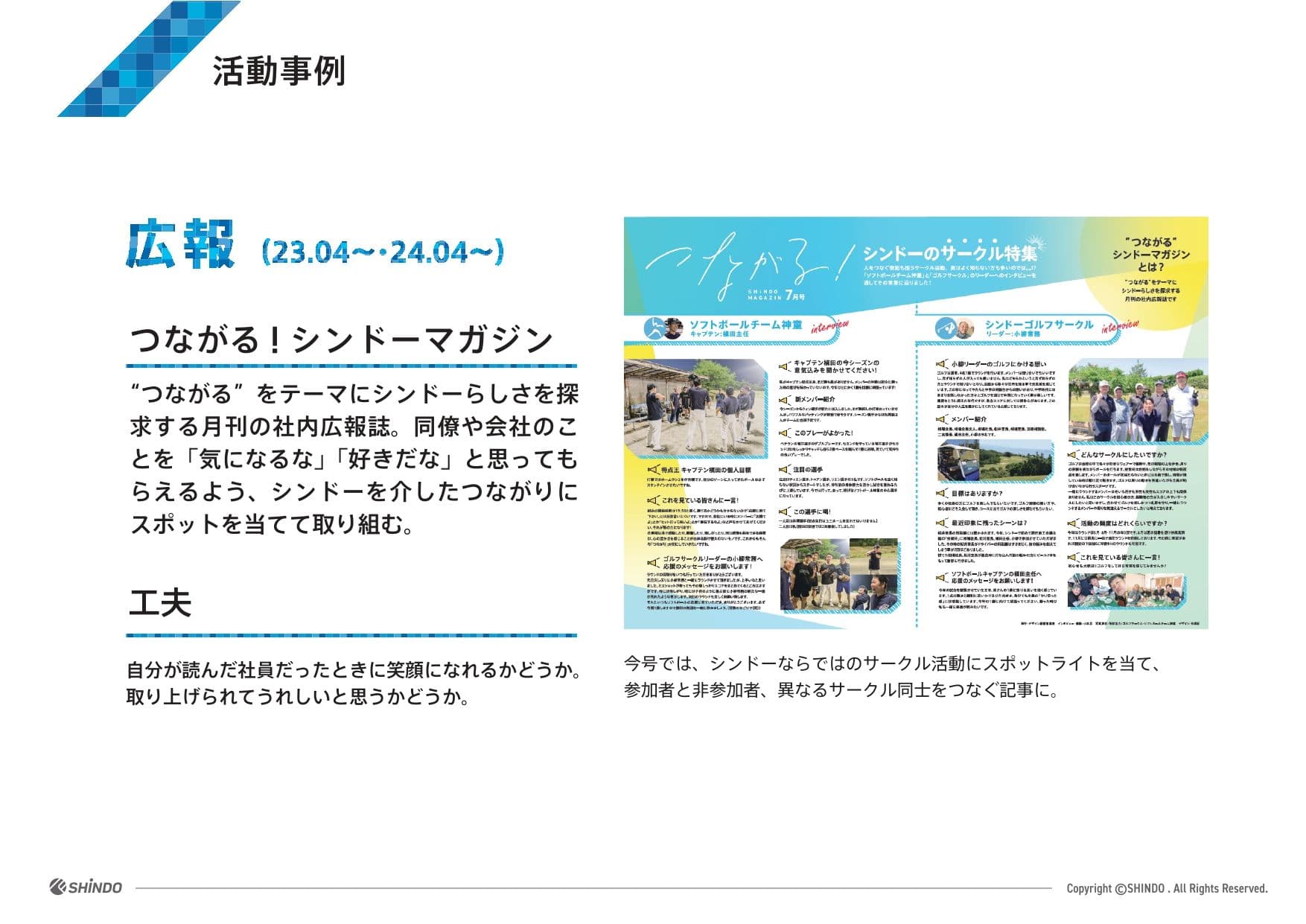 最後にご紹介する活動事例は広報活動です。無関心を関心に、LIKEをLOVEにするには、お互いがどういう人なのかをシェアし合うことは非常に大切だと考えていますので、広報活動には力を入れています。今期からデザイン経営推進室では、自社らしさや自社の文化にスポットライトを当てた繋がりを特集して、記事を作成しています。スライド内の記事では、弊社のサークル活動であるソフトボールチームとゴルフサークルを特集しました。実際に社内報を見た社員からは「記事を見てソフトボールの試合に応援に行きたくなりました」といったコメントをもらえたので、社内の繋がりを生むきっかけになっているのかもしれないと感じています。