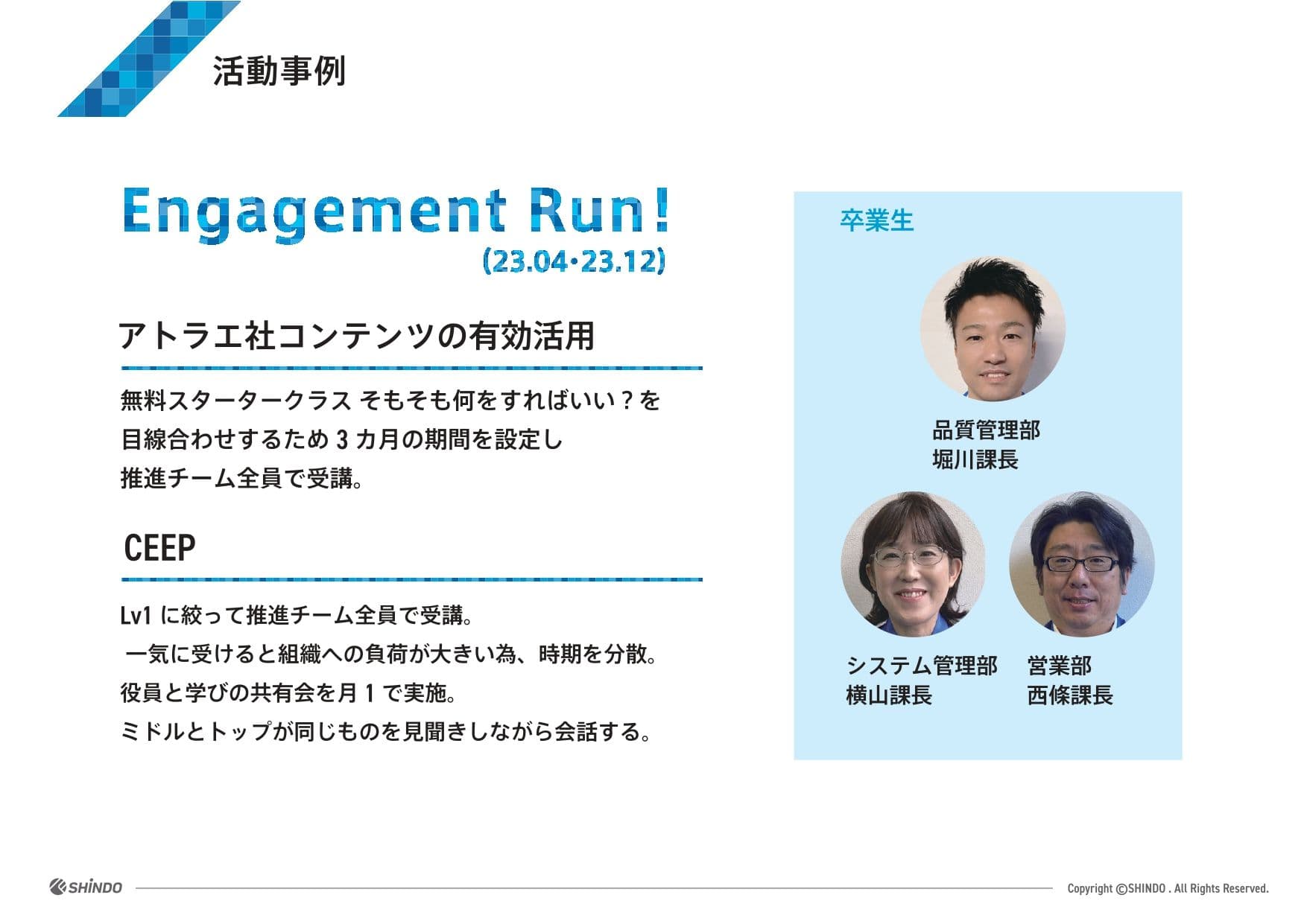 また弊社では、Engagement Run!Academyを活用させていただいています。導入初期は、そもそもエンゲージメントって何ですか、何をすればいいんですかみたいな状態からスタートしたので、推進チームの皆さんで無料の公開クラスのスターターシリーズに参加させていただき、エンゲージメントへの理解を深めました。あとは、Engagement Run!Academyのエンゲージメント実践認定プログラムであるCEEPにも参加させていただいており、そこから派生した取り組みとして、役員との学びの共有会を月に1回実施しています。推進チームのメンバーは基本的にミドル層なので、ミドル層とトップ層が勉強して感じたことをシェアし合うことで、お互いの関係性を築く機会にもなっていると感じています。