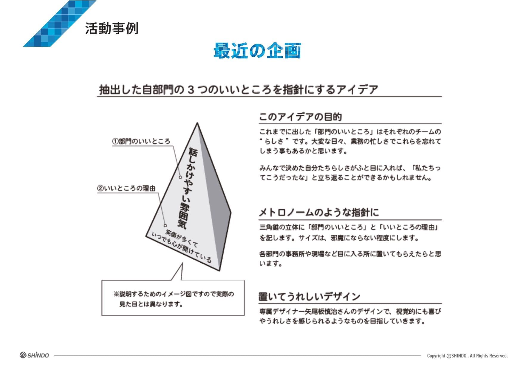 こちらは現在計画中の企画です。先ほどのコンテンツで自部門のいいところに関する対話会をご紹介しました。この企画では、その中でも特にいいと思う点とその背景や理由を各部門で3つまとめてもらい、その3つの内容が書かれた三角錐の立札を希望する方のデスクに置くものです。せっかくいい対話を行ってもらえているので、忙しい時や大変な時でも自分たちのいいところを思い出して持続できるように、デザインの力を使っていければと考えています。