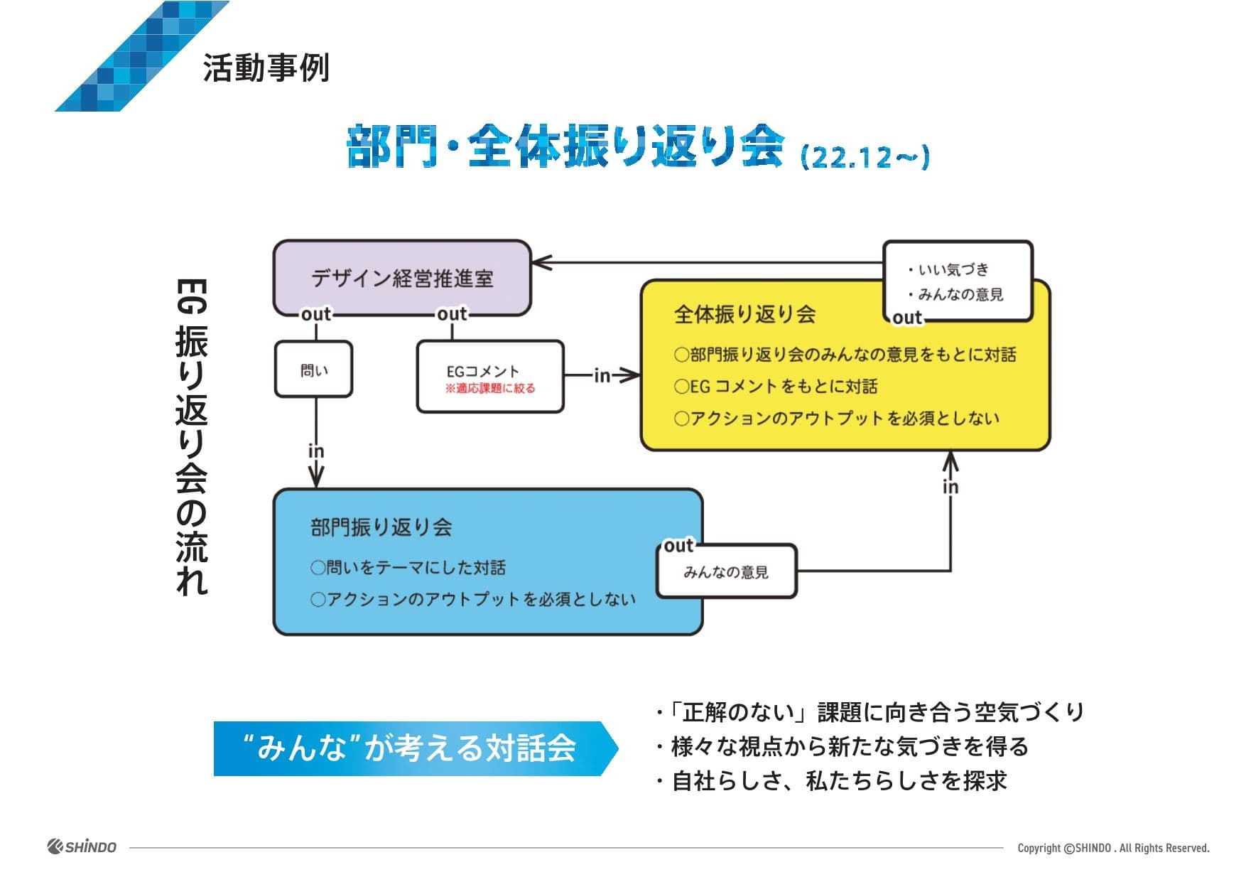 運用において弊社が大きく意識していることは、クローズドな雰囲気ではなくオープンな雰囲気にすること、お互いに無関心という状態から関心を寄せ合ってLIKEになったりLOVEになったりしていくこと、そしてその根っこにシンドーらしさがあるという状態になることです。そのための取り組みの一つとして、部門全体振り返り会を実施しています。