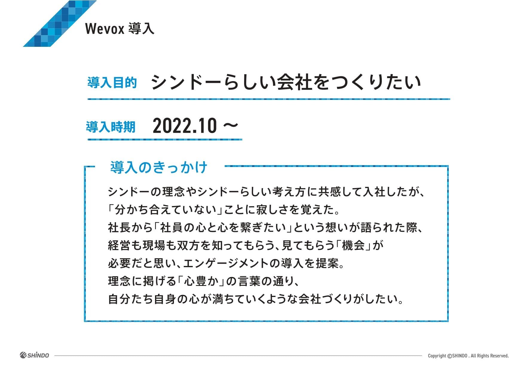 Wevoxの活用事例を学び合うユーザー参加型イベント「Teamwork Session」。今回は株式会社シンドーの事例をご紹介します。2022年にWevoxの導入を開始した同社。導入後から実施した様々な企画により、社内にはどのような変化があったのでしょうか?
