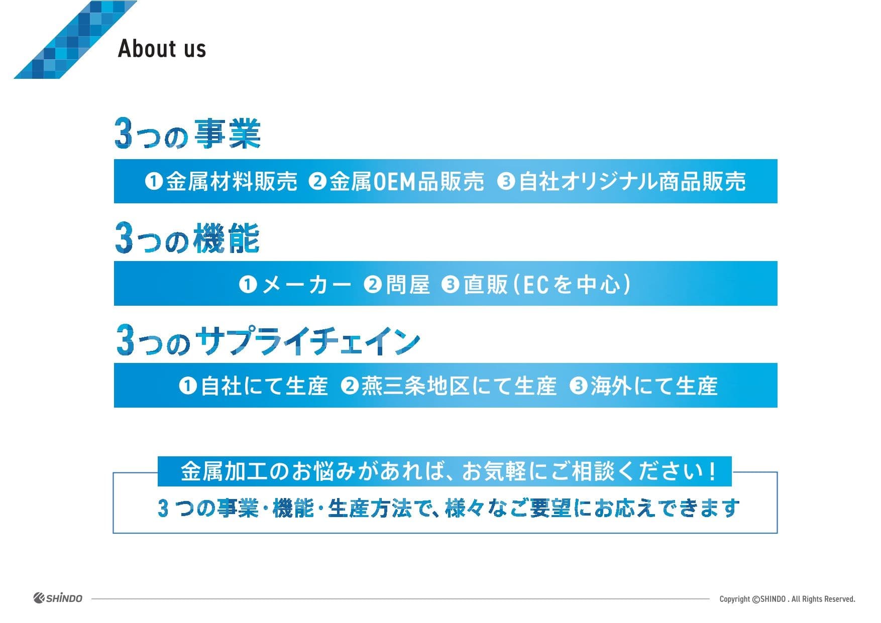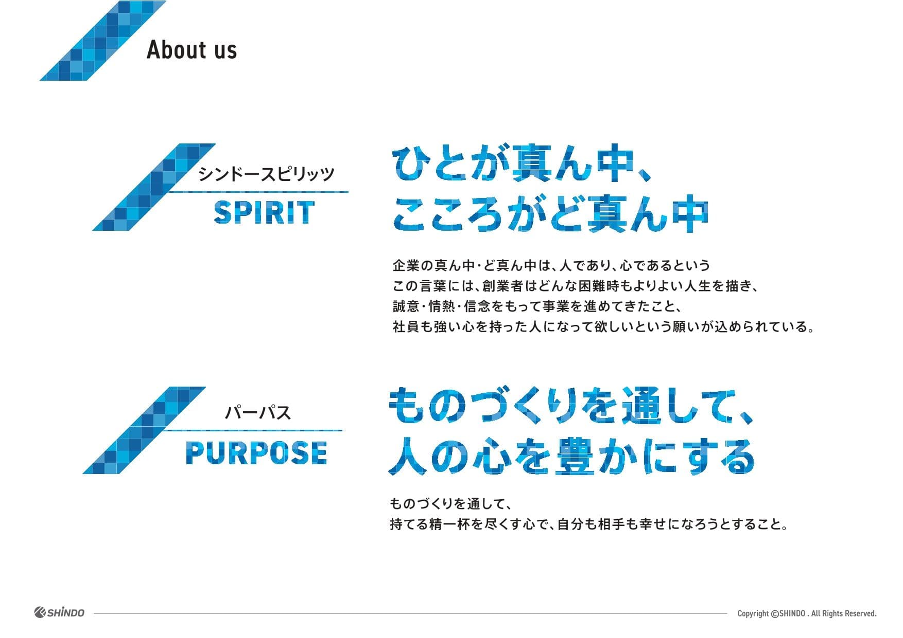 弊社の代表は現在4代目ですが、3代目の社長が、理念を中心に経営活動を行う、理念経営を取り入れました。その中でも特に対して大切にしているものがこの2つの考え方です。弊社は元々、金属の材料を販売する事業から始まった会社です。納品先のお客様からいただいた、金属の材料を曲げられないか、くっつけられないかといったご要望に応えていく中で道が開き、その後のOEMの製品事業や自社商品事業に繋がりました。現在ではそういった事業が弊社を支える柱になっています。目の前の困難を乗り越えていこうとする強い心を大切にしていくことが、スライドにある弊社のシンドースピリッツです。その上で自分たちが目指したい姿として、ものづくりを通して人の心を豊かにする存在になることをパーパスとして掲げています。弊社にとって、心豊かという言葉は非常に重要なキーワードになっています。