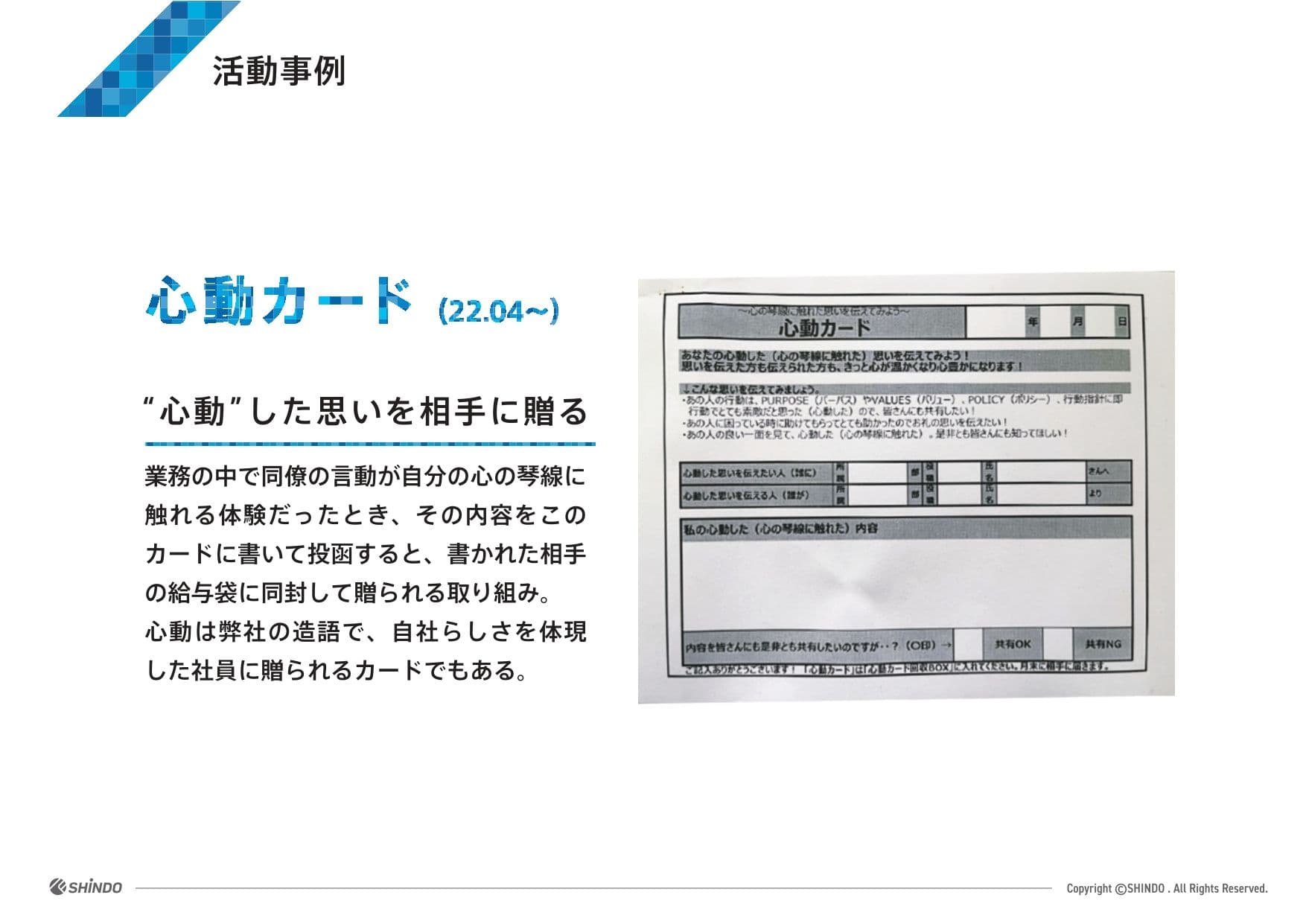 続いて心動カードという取り組みのご紹介です。これはシンドーという社名に心が動くという漢字を掛け合わせた造語で、心が動いた出来事を紙に書いて投函します。投函した紙に名前が書かれた相手は、給与が渡される時に心動カードも一緒に渡される仕組みとなっているので、自社らしさを体現した社員に送られるカードでもあります。