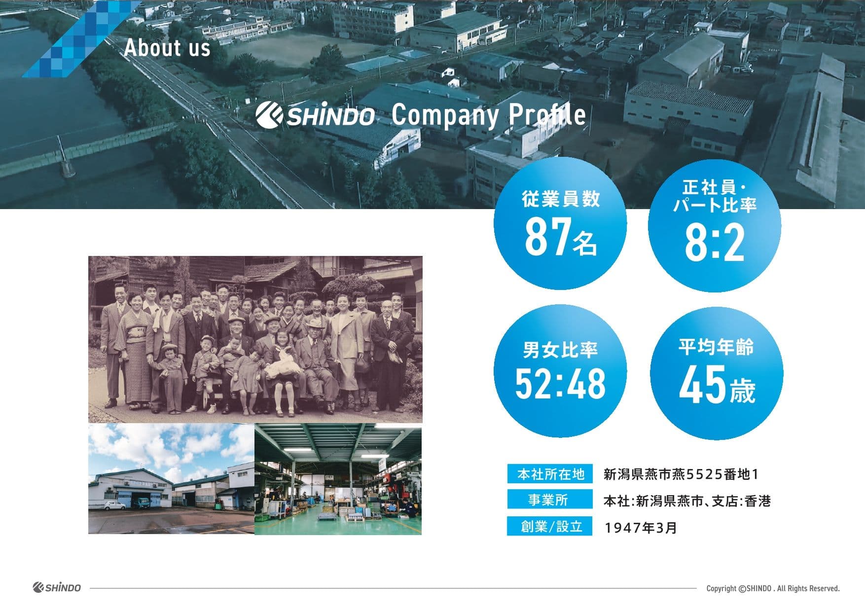 相場(雄):株式会社シンドーの本社は、雇用の30%ほど製造業が占める物作りの町、燕三条地区にあります。1947年に創業し、今期で78期目を迎えました。社員数は現在87名で、そのうち正社員・パート比率が8対2、男女比率は5対5ほど、平均年齢は45歳という構成になっています。スライド内の白黒の写真は、創業間もない頃に撮影された貴重な1枚です。