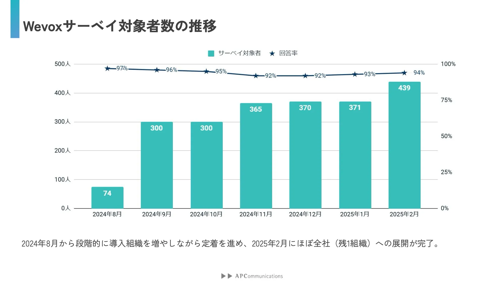このようにWevoxのサーベイを利用する組織を段階的に増やしていった結果、2024年8月に回答者74名からスタートし、2025年2月には439名と、ほぼ全社員への展開が完了しました。特に、回答率が常に90%を上回る形で推移している点は、定着が上手くいっていることを示す1つの証だと考えています。サーベイは、正社員と契約社員、そして一部のパートナー社員を対象としています。配信頻度は毎月1回で、回答方式は実名です。また、閲覧権限は事務局だけではなく、現場の管理職やメンバーにも付与しています。