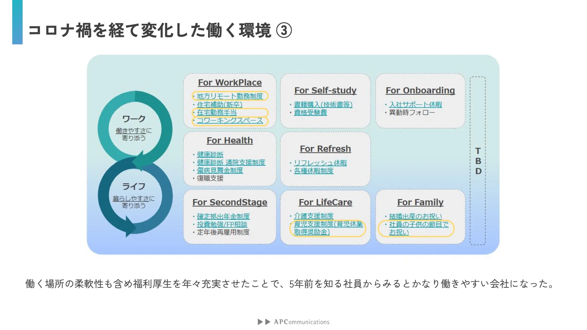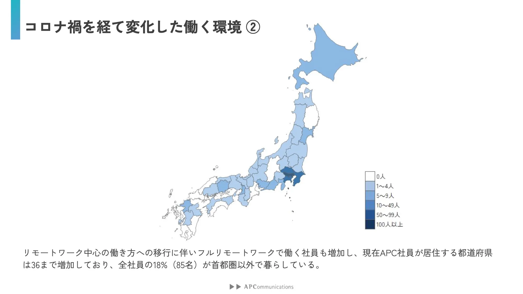 続いて、コロナ禍を経て変化した環境についてです。それまでは全員が出社していましたが、コロナの流行と同時にリモートワーク中心の働き方へと移行しました。現在はリモートワークを行っている社員が92%、そのうちの80%以上がリモートワーク中心の働き方、50%以上がフルリモートで業務を実施しています。フルリモート勤務の導入により、地方在住での勤務が可能となったことで、現在では全社員の約18%にあたる約85名が首都圏以外に居住しています。その結果、APC社員の居住地は全国36都道府県にまで広がりました。また、働く場所の柔軟性も含め、福利構成の充実にも毎年取り組んでいて、5年前を知る社員からも「かなり働きやすい会社になってきた」との声があがっています。