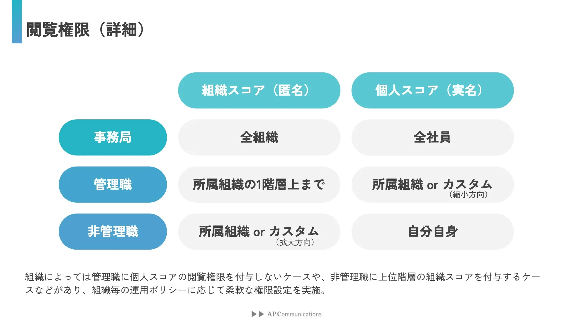 事務局は全組織・全社員を閲覧できるようにしています。管理職の場合は、組織スコアは所属組織の1回層上まで、個人スコアに関しては所属組織全員分を閲覧できます。管理職ではない人は所属組織の平均スコアは閲覧できますが、個人スコアは自分のスコアのみが閲覧可能です。ここからさらに組織のニーズを聞きながら様々なカスタムも加えているので、かなり柔軟な権限設定となっています。