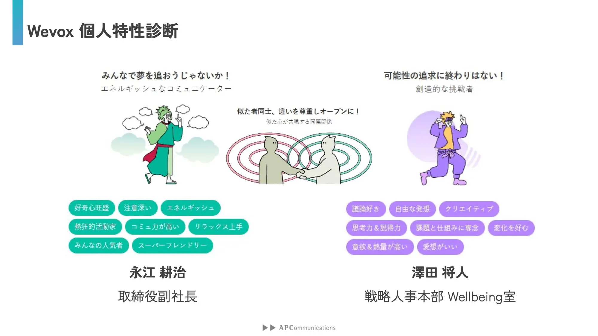 こちらはWevox個人特性診断を使用して私たちの特性を診断したものです。私が創造的な挑戦者タイプで、永江がエネルギッシュなコミュニケータータイプという結果が出ました。2人の関係性も見られるようになっていて、似たもの同士で違いを尊重しながら、オープンな関係で活動を行っています。