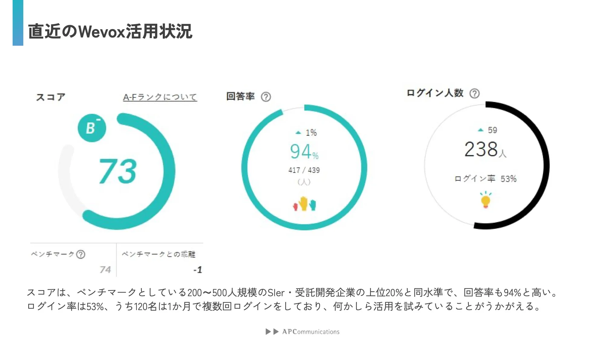 こちらは直近のWevoxの活用状況です。総合スコアの73点はベンチマークとしている200〜500人規模のSIer・受託開発企業の上位約20%と同水準で、回答率も94%となっています。ログイン率は53%で、約120名が1ヶ月で複数回ログインをしているため、何かしらの活用を試みていることが伺えます。