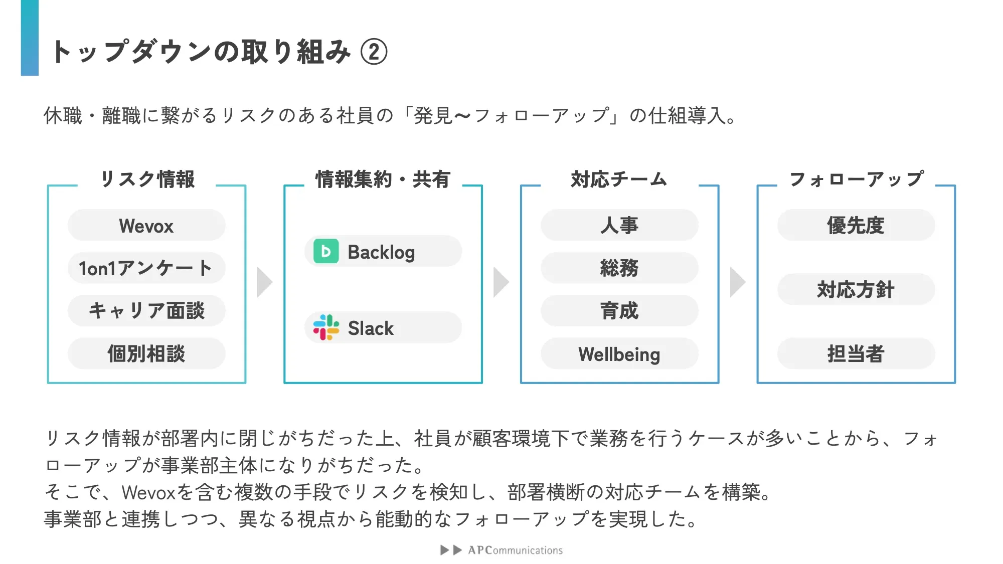 2つ目のトップダウンの取り組みは、休職や離職に繋がるリスクを抱える社員を早期に発見して適切にフォローアップする仕組みの導入です。以前から部分的に実施していた取り組みではありますが、リスク情報が部署内に閉じがちだった上に、社員が顧客環境下で業務を行っているケースも多いことから、これまでは事業部主体のフォローアップになりがちでした。そこで、Wevox、1on1のアンケート、キャリア面談や事業部側から寄せられる個別の相談内容について、本人と相談し関係者へ共有することに同意を得た場合に限り、「Backlog」と「Slack」を活用し、情報の集約と共有を行うようにしました。これまで事業部側に閉じて対応していたところを、人事・総務・育成部門とWellbeing室が一丸となって、優先順位や対応方針、対応者を定例会議で確認しながら、事業部とは違う観点からの能動的なフォローアップをしています。