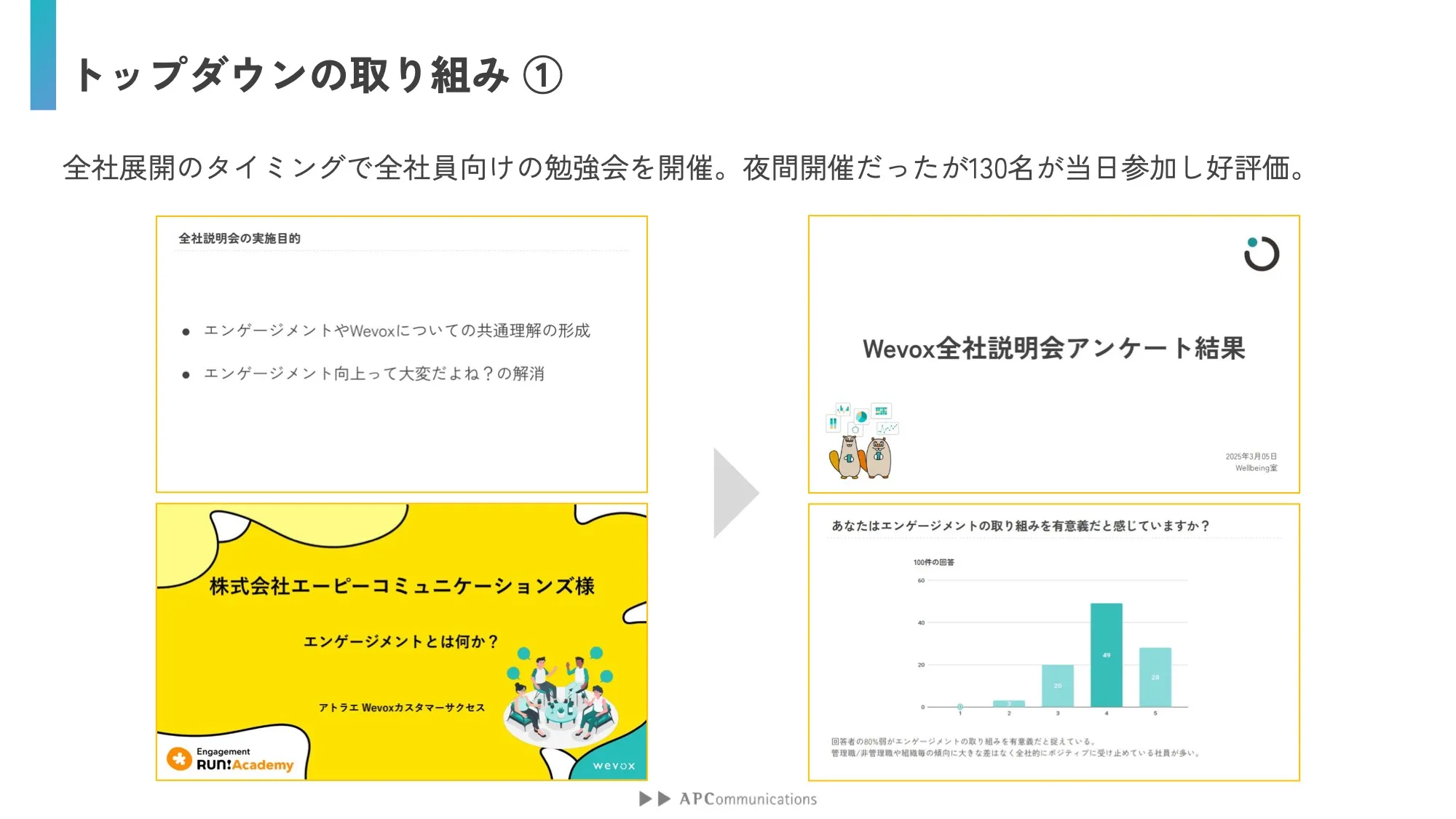 このような形式でWevoxの全社展開を進めてきた弊社では、エンゲージメント推進の取り組みがいくつかあります。1つ目はトップダウンの取り組みとして全社展開のタイミングで行った、全社向けの勉強会です。夜間開催だったにも関わらず130名もの社員が参加してくれて、内容にもかなり満足してもらえたイベントとなりました。事後アンケートの結果は後日取りまとめをして、全社員向けにレポートとして公開する予定です。