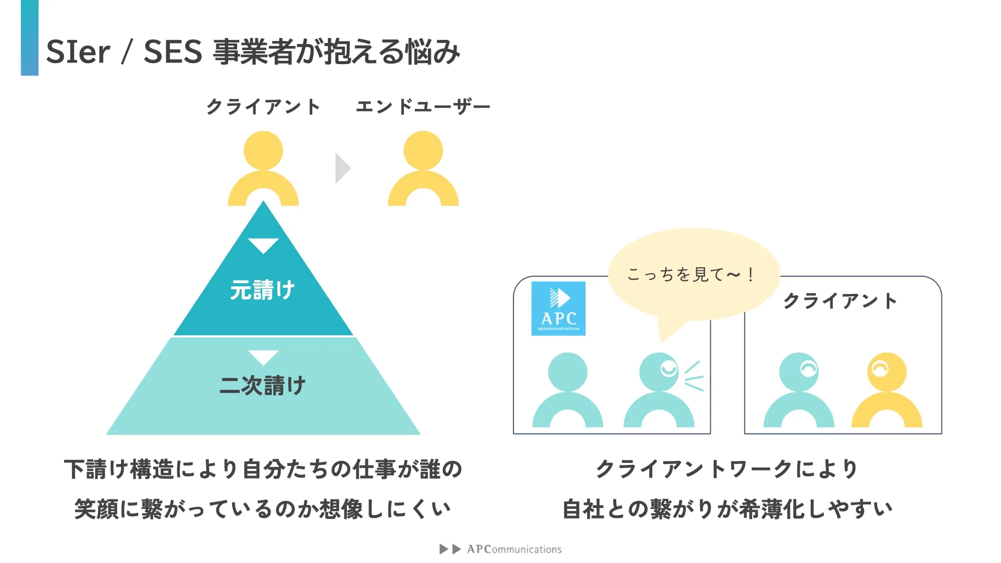 まずは、我々が働きがい向上に取り組む理由についてお話しします。こちらはSIerやSES事業者が抱える悩みを表にしたものです。左側はSIerあるあるかなと思うのですが、下請け構造になっているため、自分たちの仕事が誰の笑顔に繋がっているのかが想像しにくいという悩みと、クライアントワークでは自社との繋がりが希薄化しやすいという2つの悩みを長らく抱えていました。これらの悩みに対しては、2つの方向性から解決を試みている最中です。