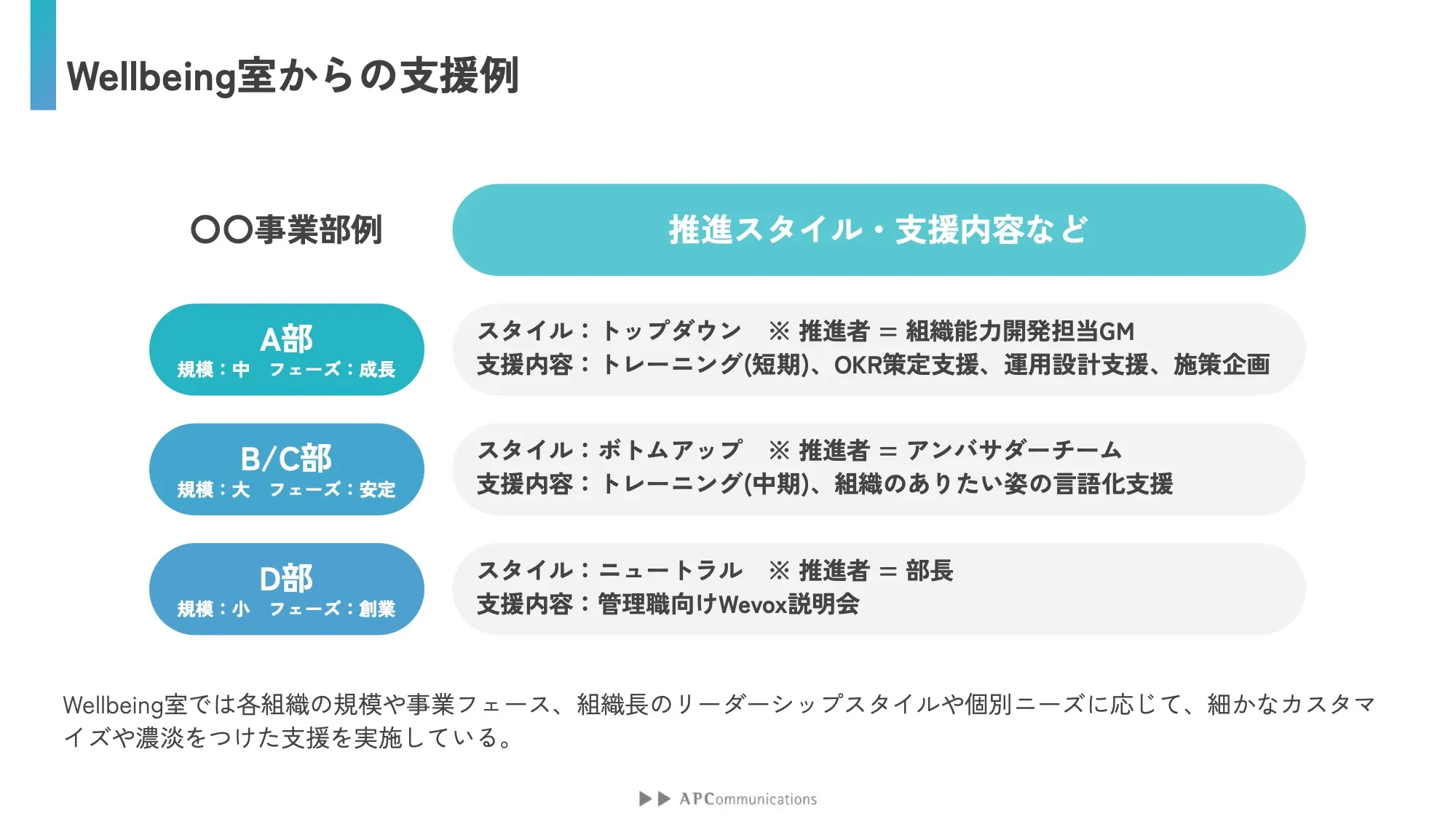 ユニークポイントのご紹介の際に部単位でカスタマイズしているとお話ししましたが、その一例がこちらです。ご覧の通り、1つの事業部の中に組織規模やフェーズが異なる4つの部があります。A部は成長フェーズ、B/C部は安定フェーズ、D部は創業フェーズといったように分かれています。さらに組織長のリーダーシップスタイルや個別ニーズも関係してきます。例えば成長フェーズのA部には、短期のトレーニング、目標管理として導入しているOKRの策定支援、運用設計支援や施策企画まで入り込んで支援する。安定フェーズのB/C部には、ありたい姿の言語化支援を。D部では管理者向けの説明会を開催するなど、グラデーションのある支援を実施しています。また、推進者も、組織能力開発担当のグループマネージャーが務めているケースもあれば、意欲の高いアンバサダー的な存在を設けている部門や、部長本人が推進者になっているケースもあります。それぞれの部の、組織規模・フェーズ・組織長・推進者の違いを加味し、カスタマイズするようにしています。