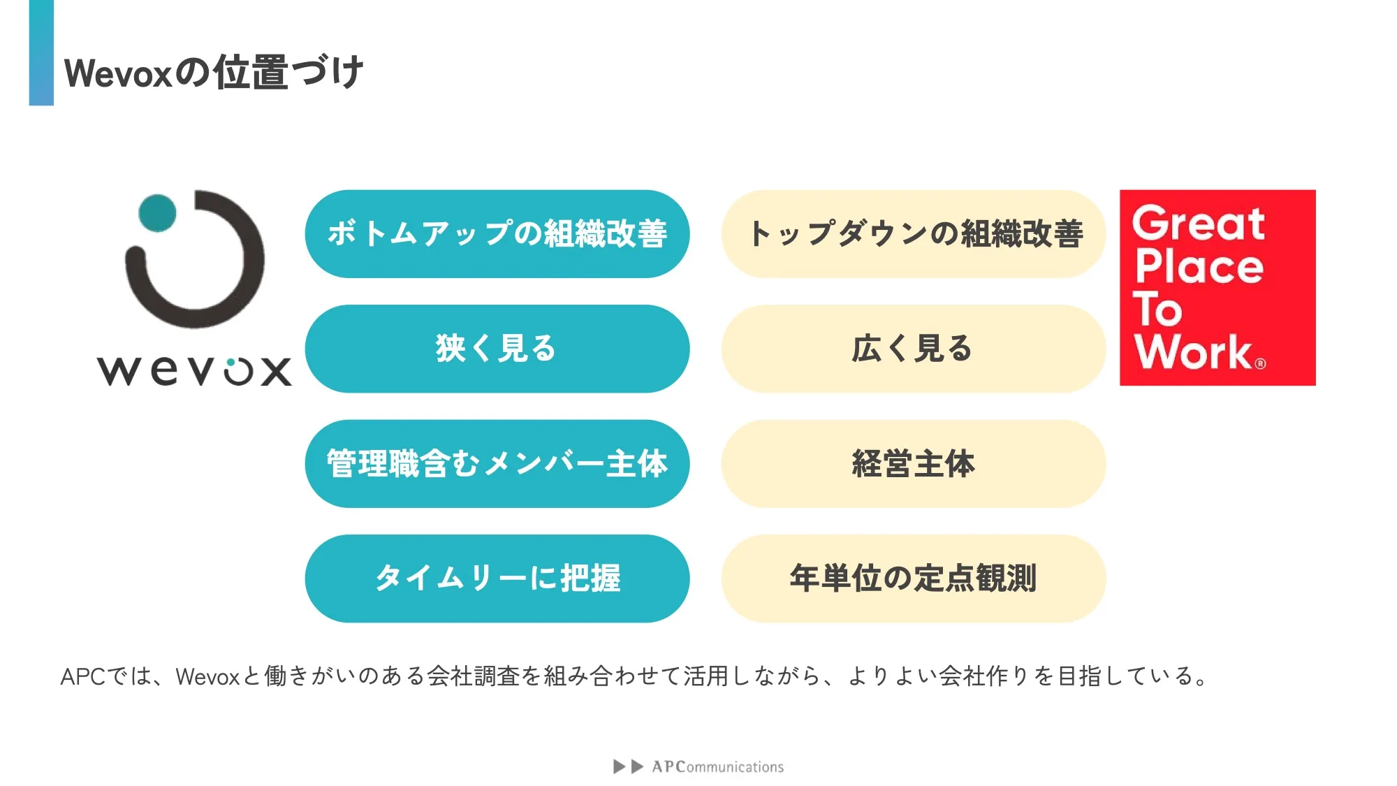 Wevoxの活用事例を学び合うユーザー参加型イベント「Teamwork Session」。今回は株式会社エーピーコミュニケーションズ様から永江 耕治さんと澤田 将人さんをお招きし、同社がWevoxを全社導入するにあたって実施した取り組みをご紹介いただきました。一斉導入とは大きく異なる背景にご注目ください。