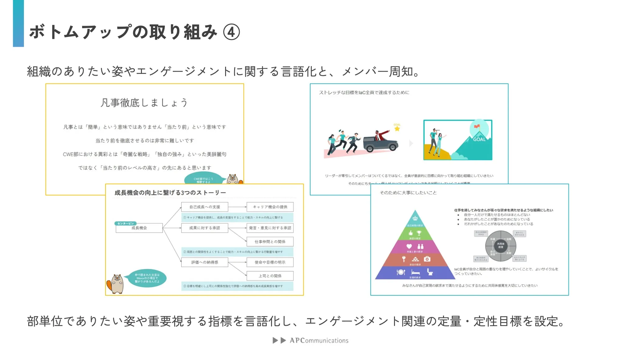 4つ目の取り組みが、組織の「ありたい姿」やエンゲージメントに関する考えを言語化しメンバーに周知・浸透させる営みです。部長や事業部長が、重要視する指標や組織のありたい姿を言語化して、それを社員に直接伝えています。
