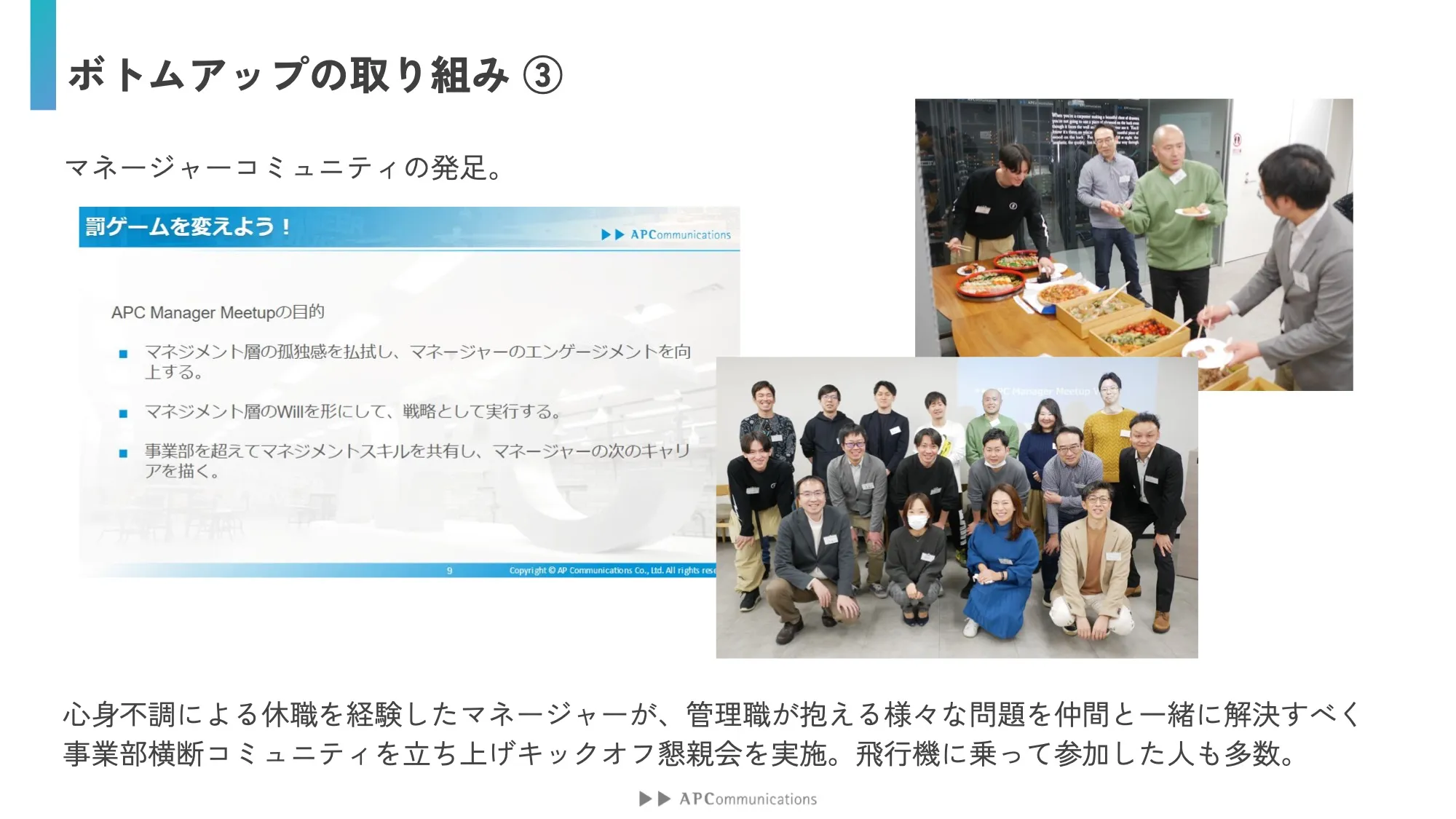 そして3つ目。最近、弊社ではマネージャーコミュニティというものが誕生しました。これは、心身不調による休職を経験したマネージャーが、管理職が抱える様々な問題を仲間と一緒に解決すべく立ち上げた事業部横断型のコミュニティです。先日キックオフ懇親会が実施されたのですが、地方在住のマネージャー数名も上京し、総勢19人が参加した、盛況なイベントとなりました。これについてはINSIDE APCという社内の情報を発信するサイトにも掲載されていますので、ご興味がある方はぜひご覧ください。