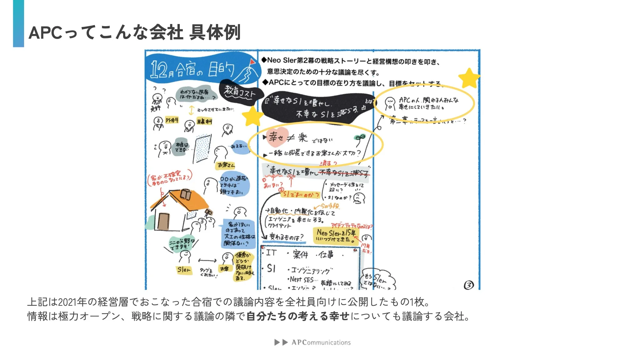 これは、2021年に経営層で行った合宿での議論内容のうち、全社員向けに公開した内容の一部です。弊社は、情報は極力オープンにすること、そして事業戦略と同じくらい自分たちの考える「幸せ」についても真剣に議論することを大切にしています。星印が付いている部分に「幸せ=楽ではない」「一緒に成長できるお客さんが大切」「APCの人、関わるみんなを幸せにしていきたい」と書かれているように、まさにこういったことについて真剣に話し合います。このマインドは、経営判断においても重要視されています。