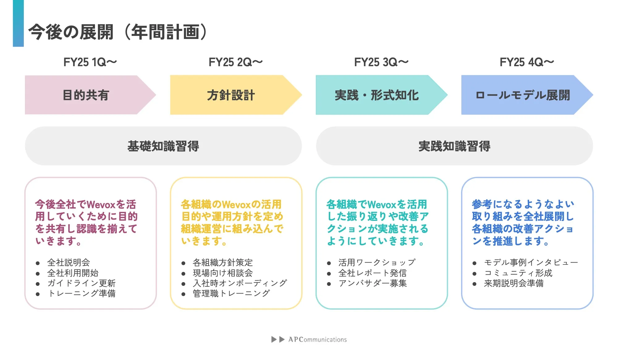 今後の展開としては、2025年の第1四半期で目的の共有を改めて行った上で、この1年間を通して方針の設計や実践・形式知化、ロールモデル展開まで進めていきたいと考えています。Wevoxの導入時期が組織ごとに異なっていたこともあり、現在も各組織の状況にばらつきがあります。そのため、引き続き個別のアクションが必要な状況です。また、働きがい向上が事業成長にとって重要だという認識は、すべての組織が持ち合わせているものの、必要とされる知識やそれに費やせる時間は組織の状況によって大きく異なります。そこでWellbeing室では、全社向けの取り組みに加え、各組織が自らの状況に応じて必要なコンテンツを選択できるよう、個別のアクションも並行して進めていく予定です。