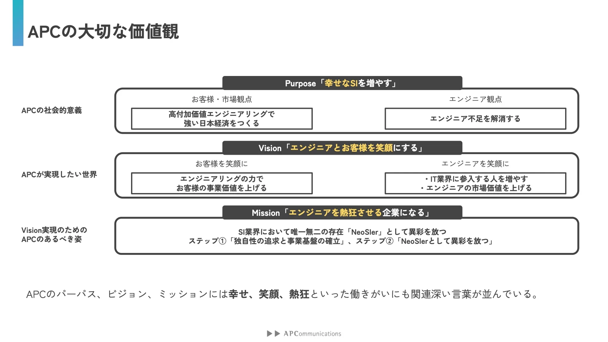 APCには大切にしている価値観というものがあり、パーパス、ビジョン、ミッションにも幸せ、笑顔、熱狂といった働きがいにも関連深い言葉が並んでいます。