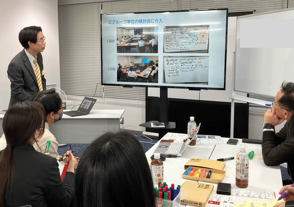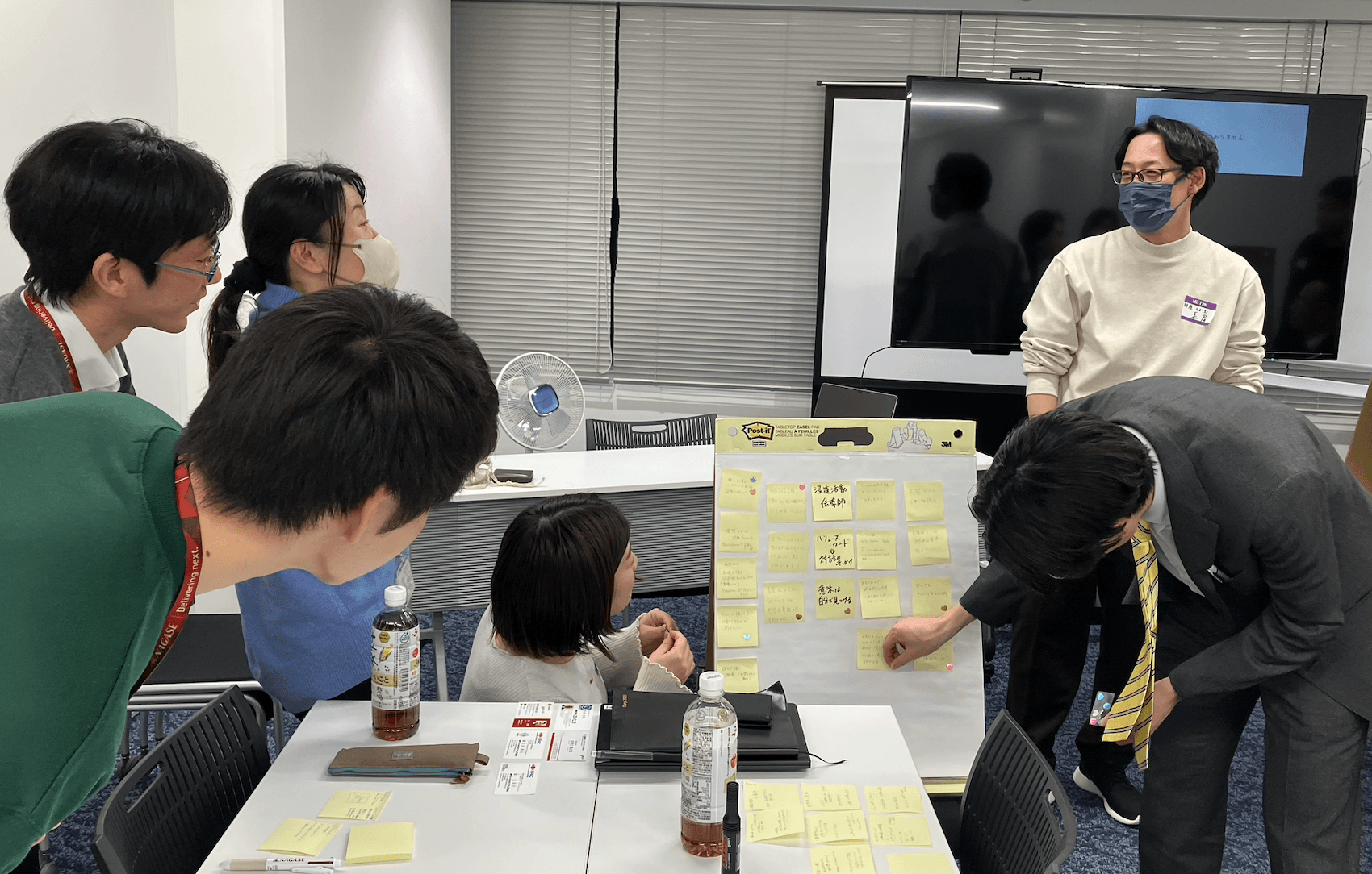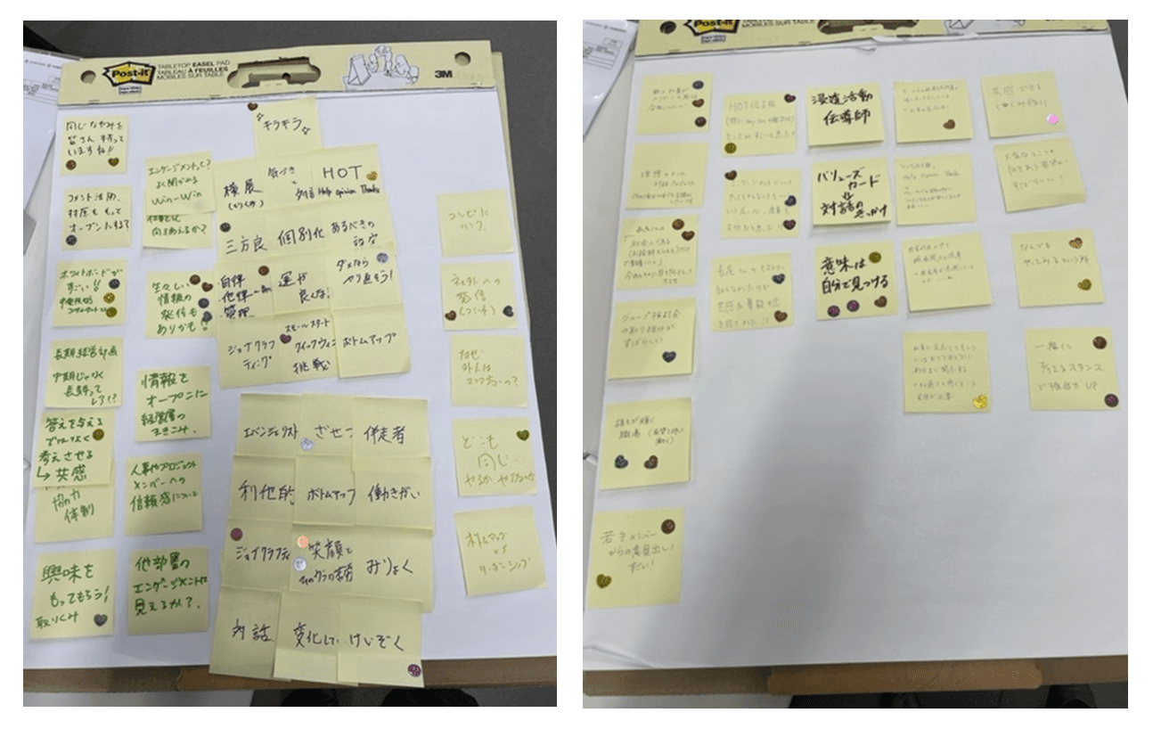 各自が、事例共有からの学びや真似したい点、他の人と対話してみたいことなどポストイットに書き出し、グループ内で共有しました。また、他の人が書き出した内容に対して、共感するコメントにシールも貼っていきます!同じ会社の方々でも、「まだ知らなかった一面や熱い想いを垣間見ることができて嬉しかった。」「生々しい現在進行形の取り組みを共有してくれたことに感謝!」など発表者を労うコメントもありました。