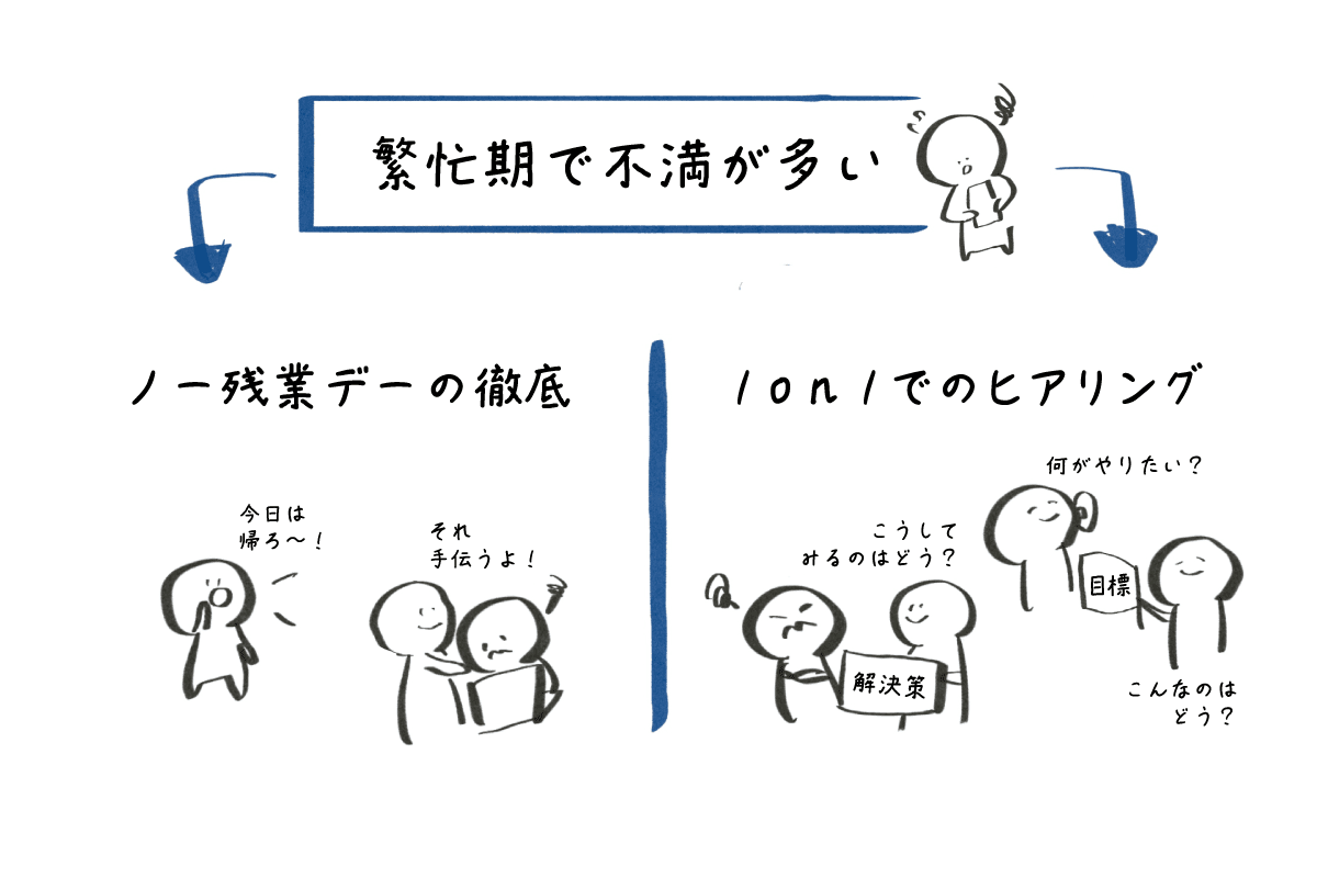 他にも、メンバーとの1on1の時間で、それぞれが抱えている不満を聞くこともしていました。変えられることは変えつつも、すぐに解決できそうにない不満に対しては、納得してもらえるように出来ない理由を伝えていました。